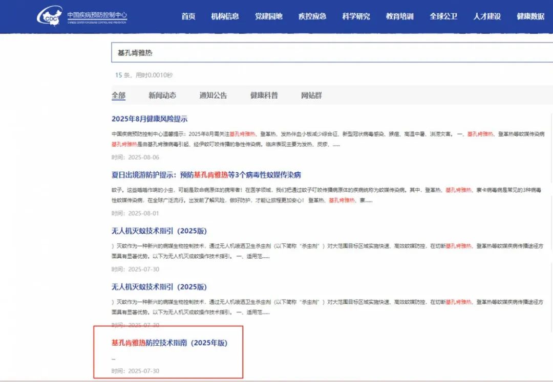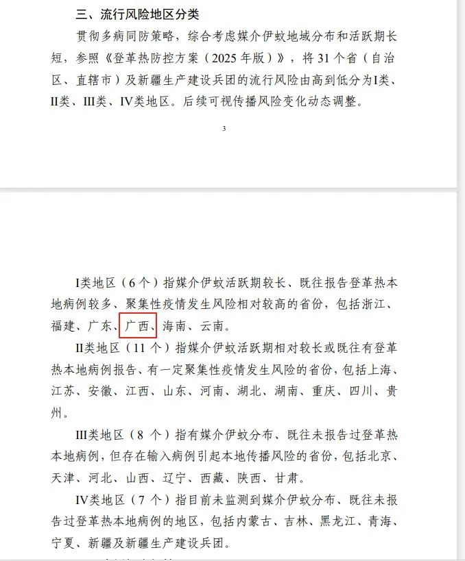 国家疾控局发布的《基孔肯雅热防控技术指南(2025版)》,广西被归类为基孔肯雅热防控Ⅰ类地区。国家疾控局官网截图