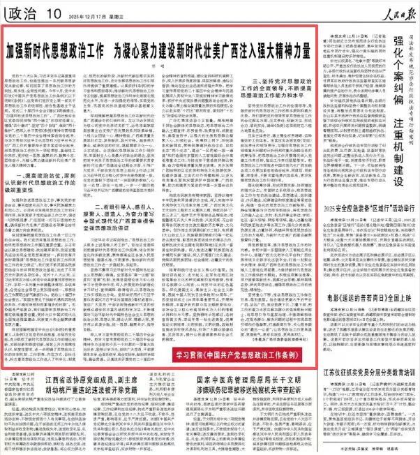 《人民日报》12月17日刊发广西壮族自治区党委书记陈刚的署名文章《加强新时代思想政治工作为凝心聚力建设新时代壮美广西注入强大精神力量》,全文如下: