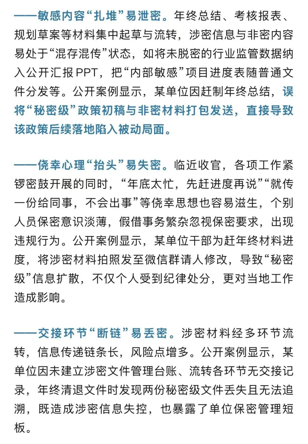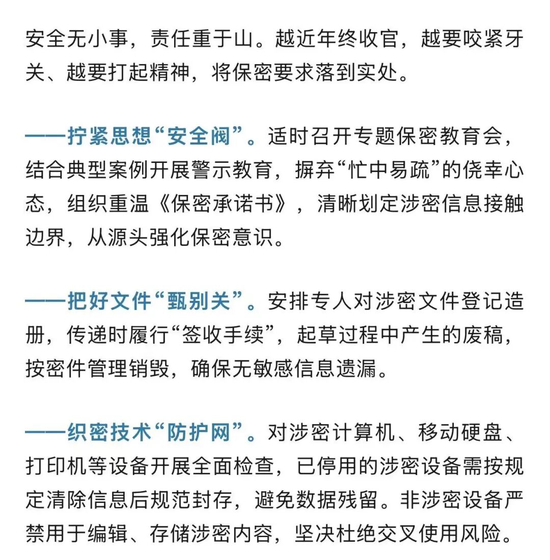 岁末年终,总结、考核、检查等工作密集开展。各类材料的整理、数据的汇总与后续计划的制定,往往涉及多方面的工作内容与内部信息。这些信息既是年度工作成果的体现,也与后续工作的衔接安排密切相关,一旦发生失泄密事件,不仅会打乱工作节奏,影响相关领域工作推进,还可能危害国家安全。