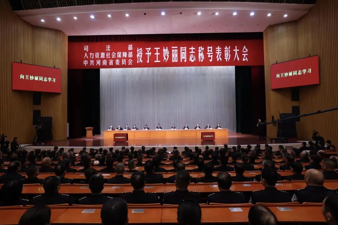 2月4日,司法部、人力资源社会保障部、河南省委在郑州召开表彰大会,授予王妙丽同志“全国司法行政系统一级英雄模范”、“河南省优秀共产党员”称号。司法部党组书记、部长贺荣,河南省委书记刘宁出席并讲话。河南省人民政府省长王凯主持。