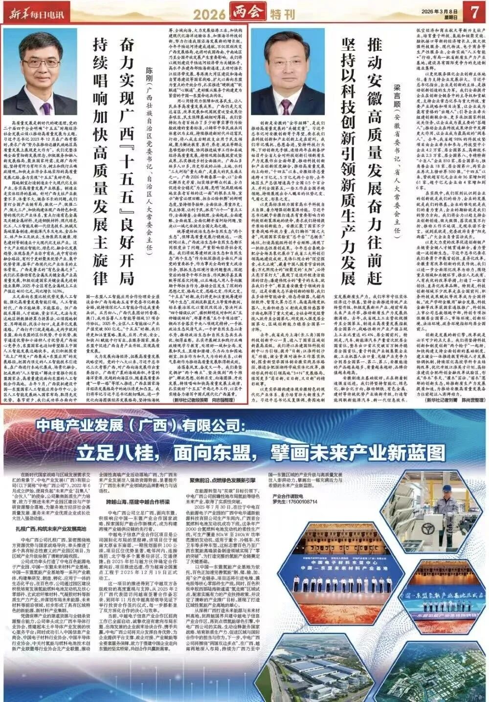 3月8日,新华社《新华每日电讯》两会特刊刊发广西壮族自治区党委书记、自治区人大常委会主任陈刚署名文章《持续唱响加快高质量发展主旋律 奋力实现广西“十五五”良好开局》。全文如下。