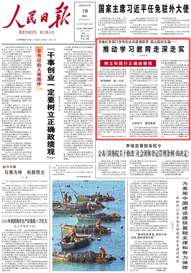 3月18日出版的《人民日报》头版刊发:《各地区各部门各单位认真谋划部署、精心组织实施——推动学习教育走深走实》。全文如下。