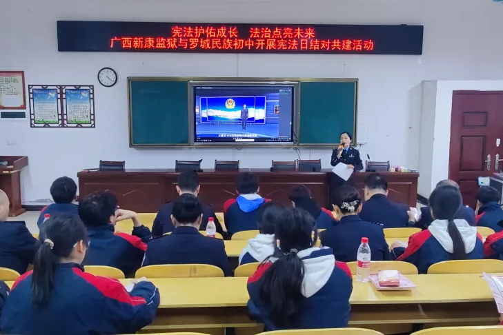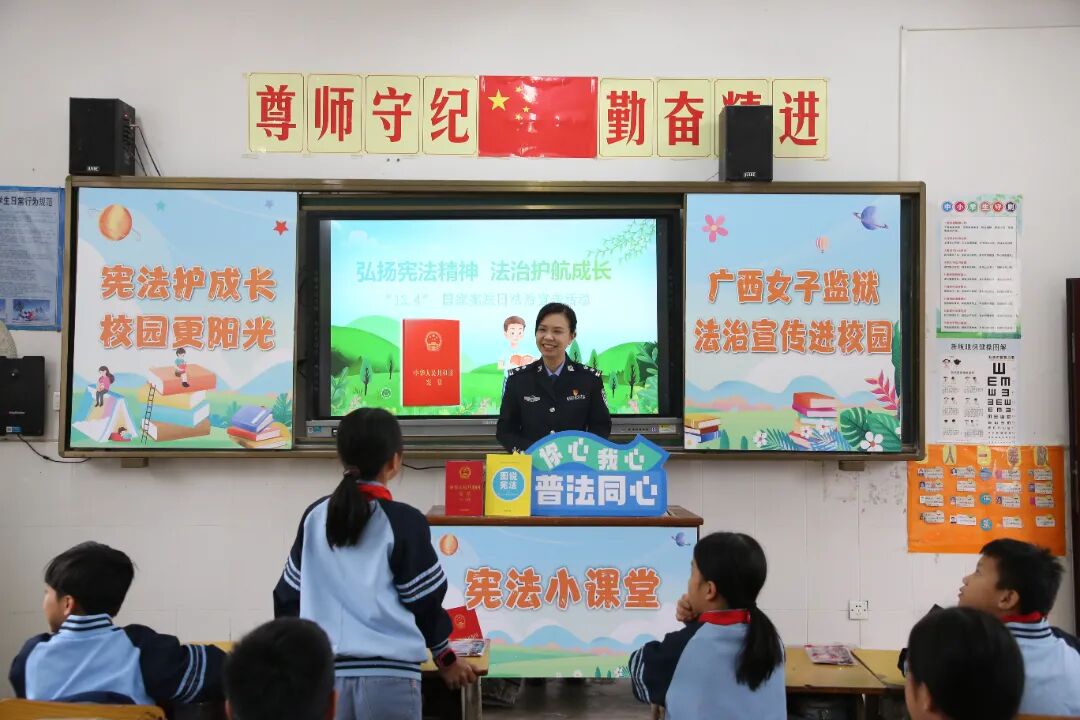 中渡监狱、桂林监狱、女子监狱、贵港监狱、北海监狱、柳州监狱、桂中监狱、柳城监狱、西江监狱、梧州监狱、鹿州监狱、新康监狱组织警察走进驻地中小学、高校以及结对帮扶学校,开展“弘扬宪法精神 法治护航成长”为主题的法治宣传进校园活动,助力构建平安法治的校园环境。