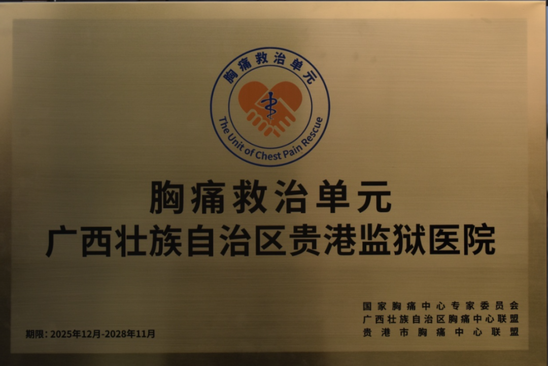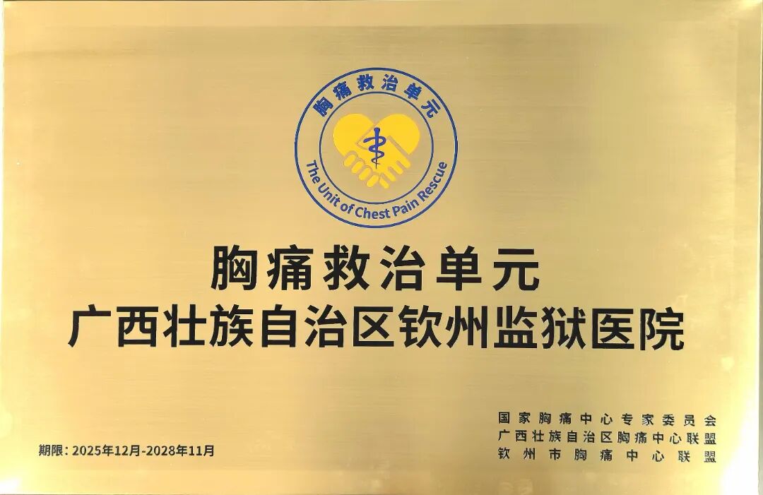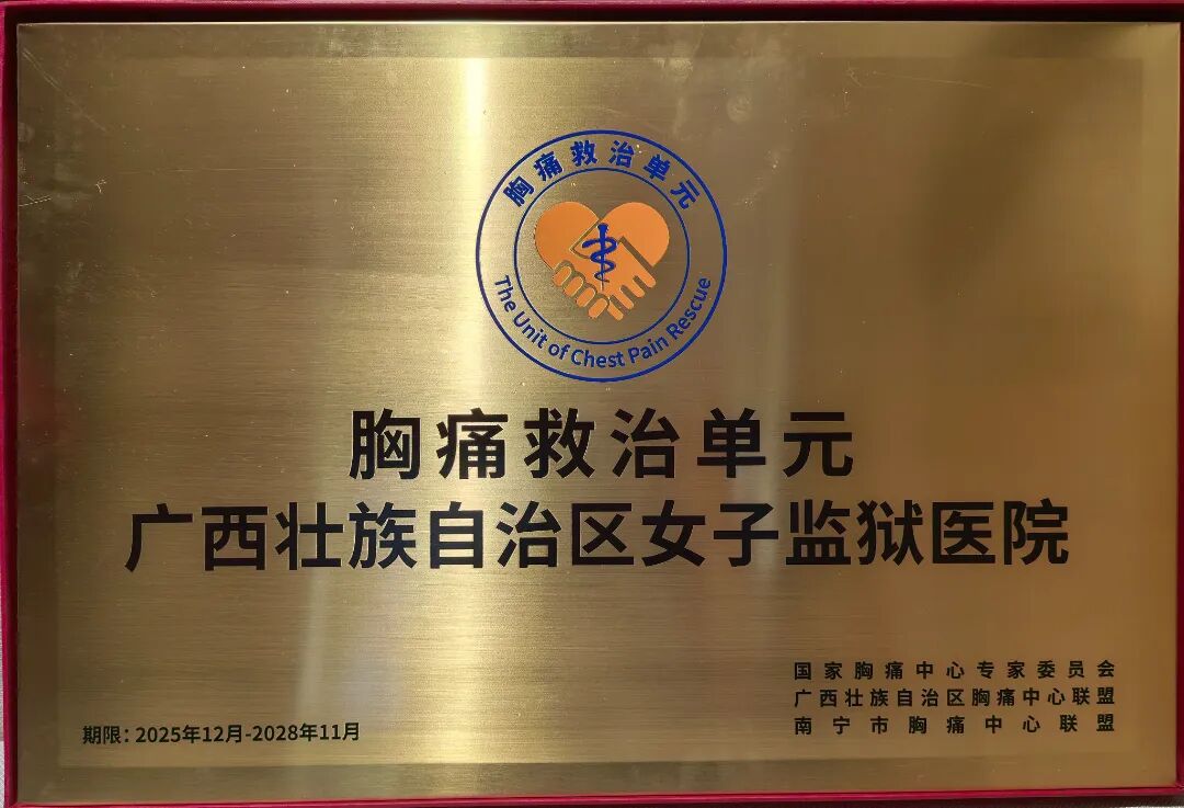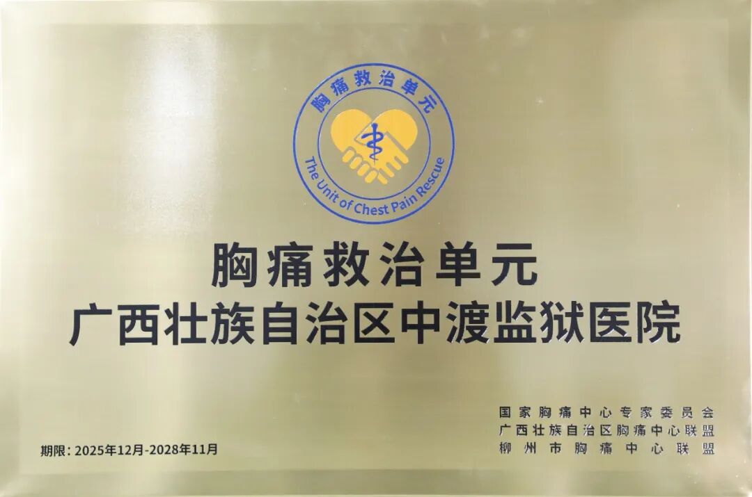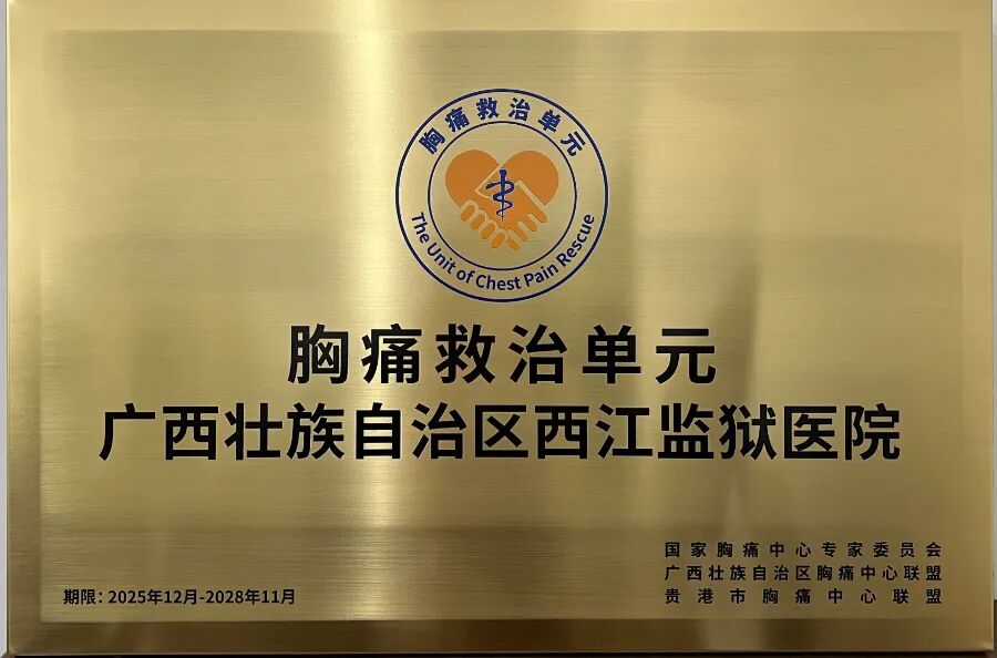 近日,在2025全国心血管健康大会的授牌仪式上,中渡监狱医院、女子监狱医院、贵港监狱医院、西江监狱医院、钦州监狱医院通过国家胸痛中心联盟认证,正式荣获 “国家级胸痛救治单元” 。这标志着广西监狱系统监狱医院在急性胸痛患者规范化救治、应急体系建设及心血管健康管理领域,均达到行业标准。