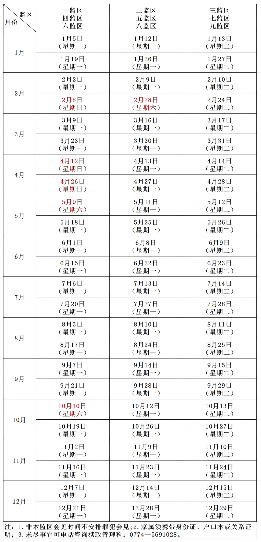 为充分发挥会见的亲情帮教作用,进一步拓宽罪犯和亲属沟通桥梁,结合监狱工作实际,现将钟山监狱2026年全年具体会见时间及有关注意事项安排如下: