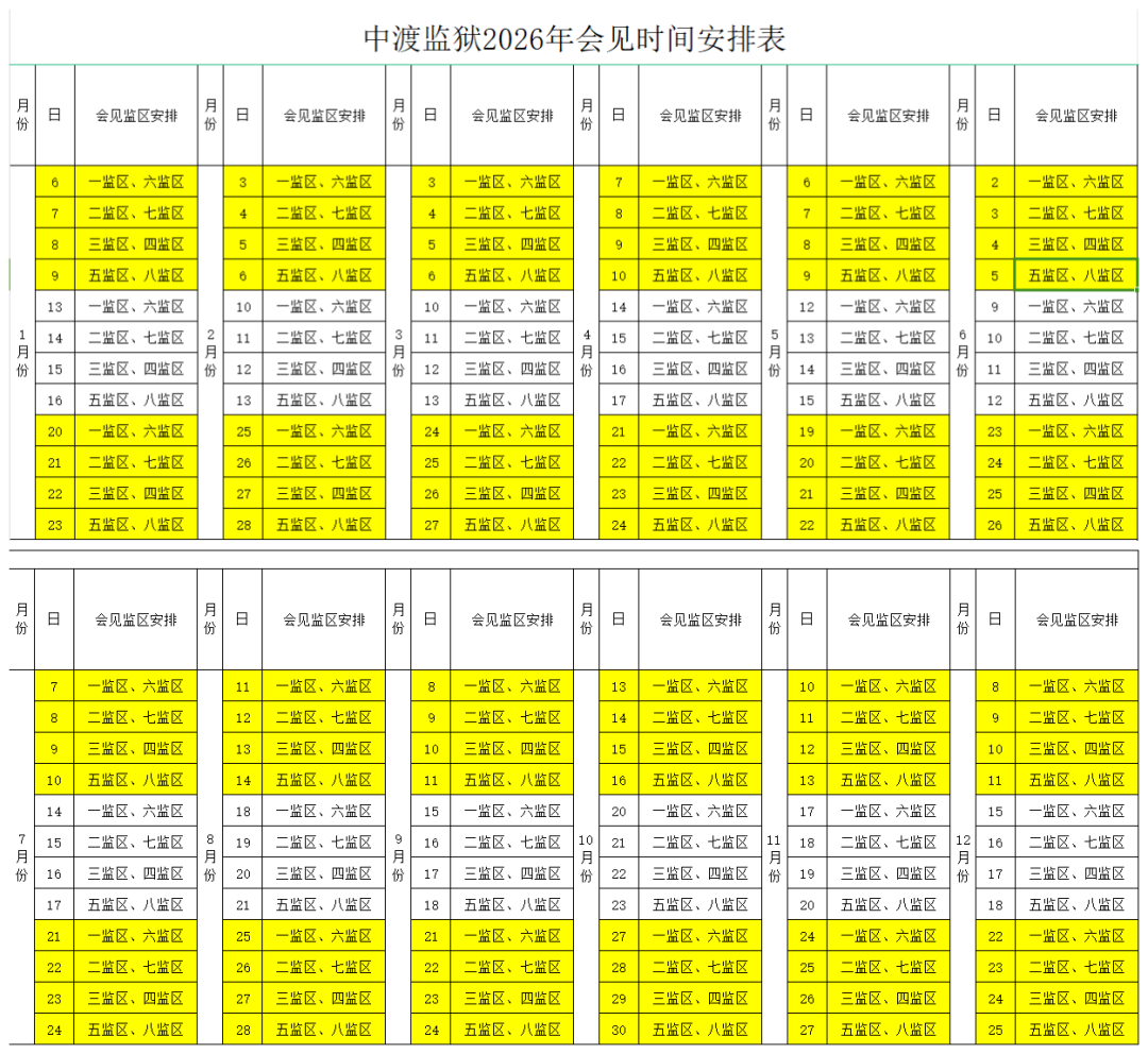 为充分发挥会见的亲情帮教作用,进一步拓宽罪犯和亲属沟通的桥梁,结合监狱工作实际,中渡监狱2026年会见时间安排及注意事项如下: