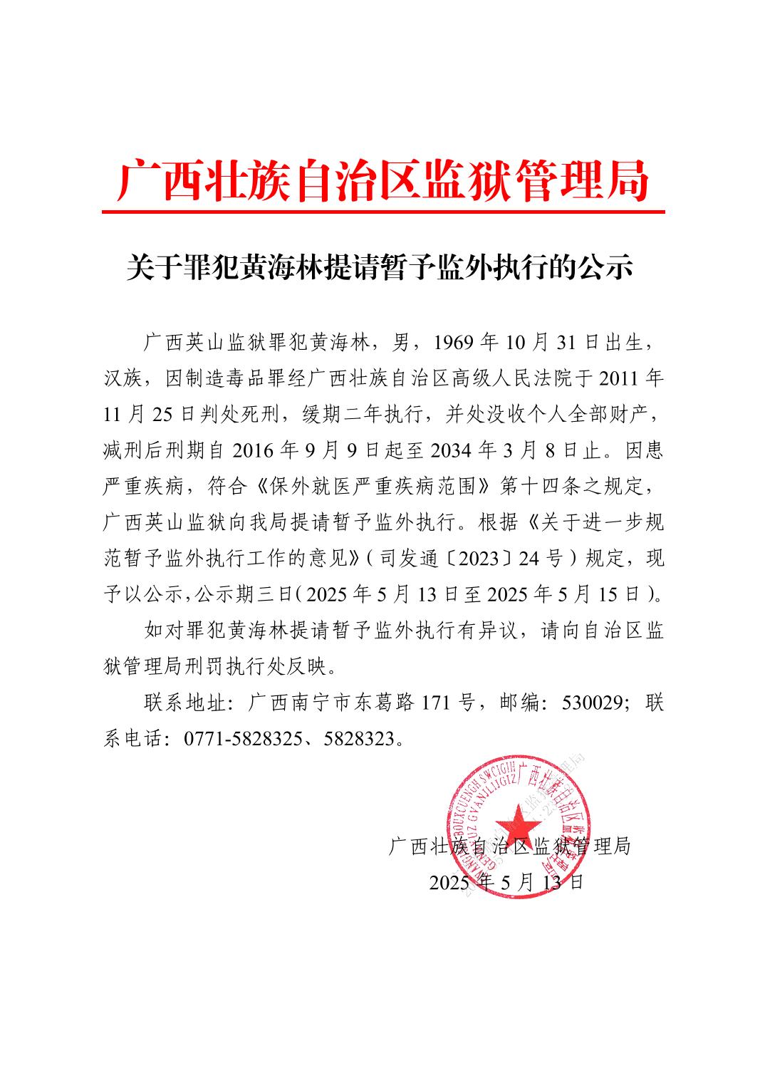 关于罪犯黄海林提请暂予监外执行的公示