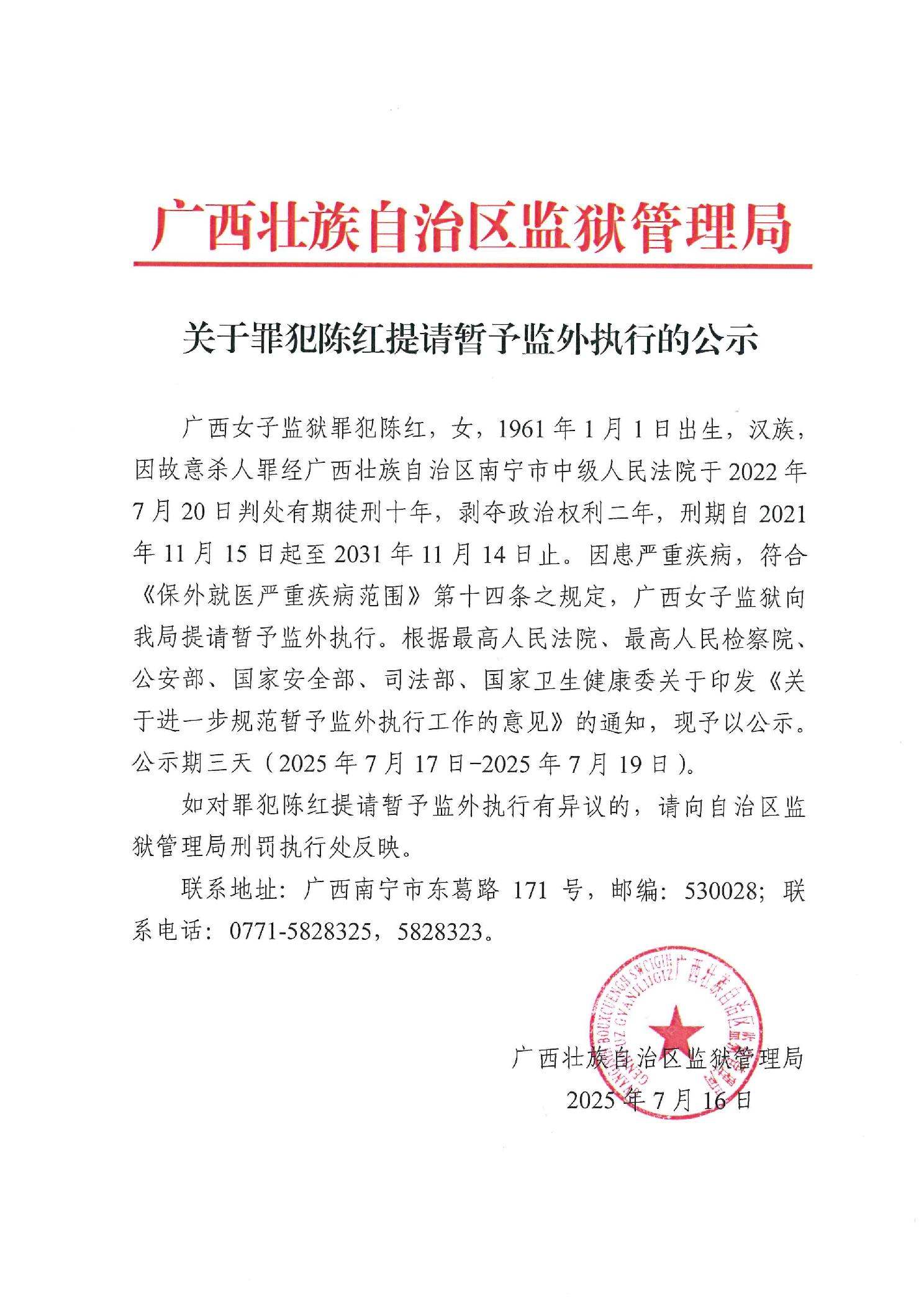 关于罪犯陈红提请暂予监外执行的公示