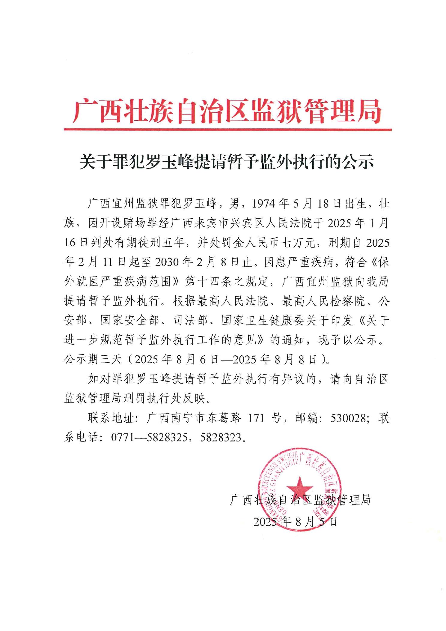 关于罪犯罗玉峰提请暂予监外执行的公示