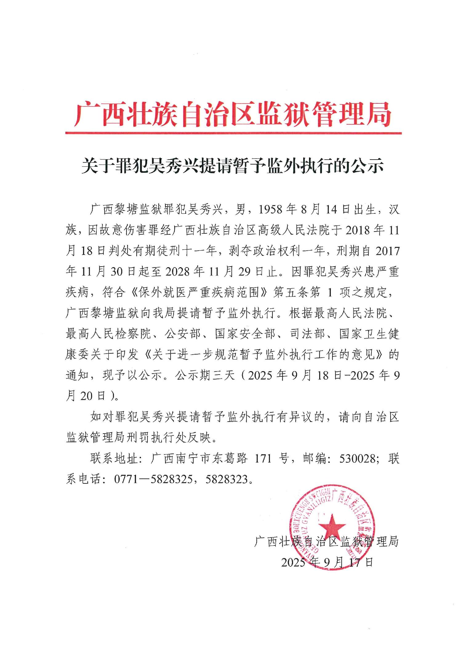 关于罪犯吴秀兴提请暂予监外执行的公示