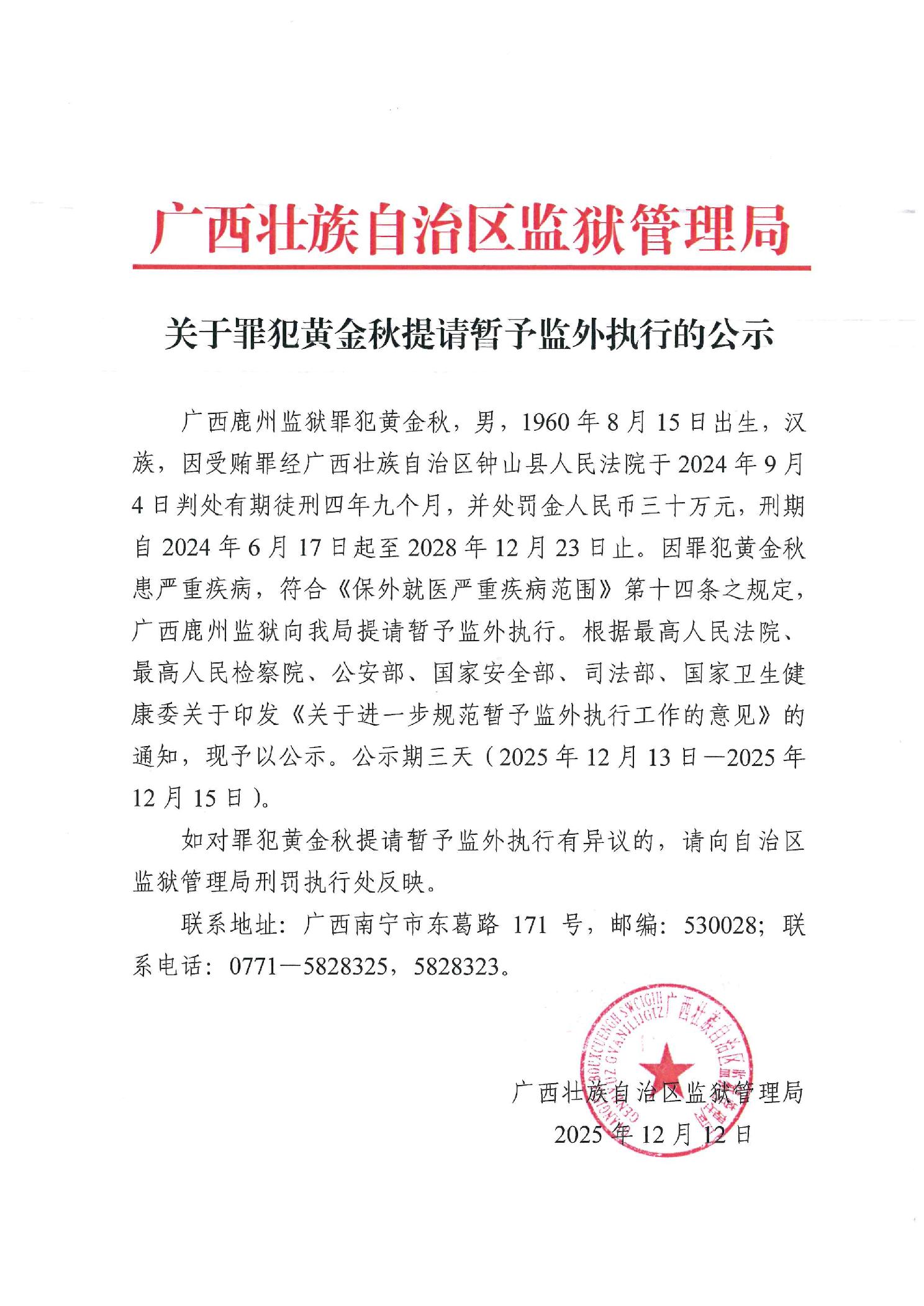 关于罪犯黄金秋提请暂予监外执行的公示