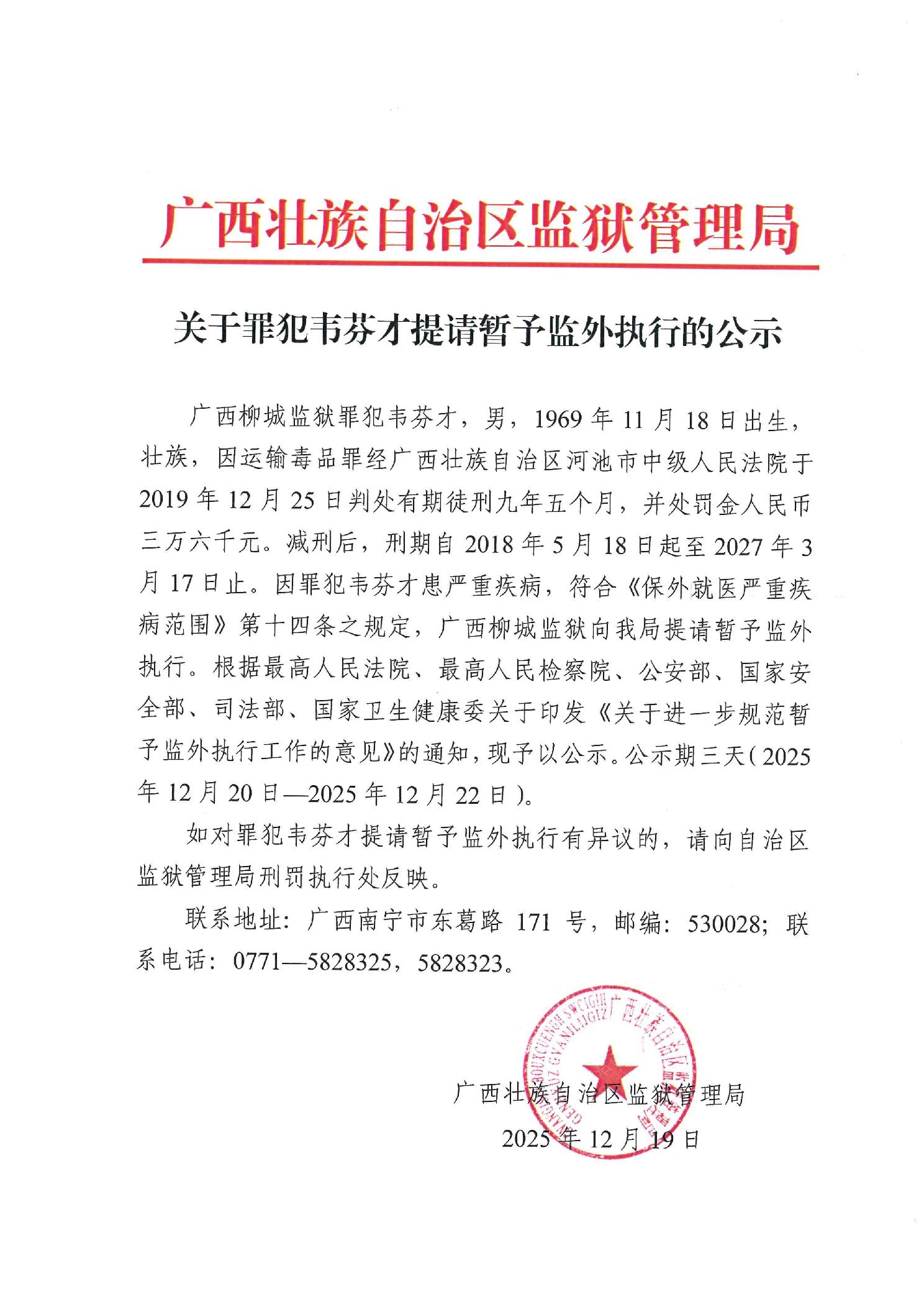 关于罪犯韦芬才提请暂予监外执行的公示