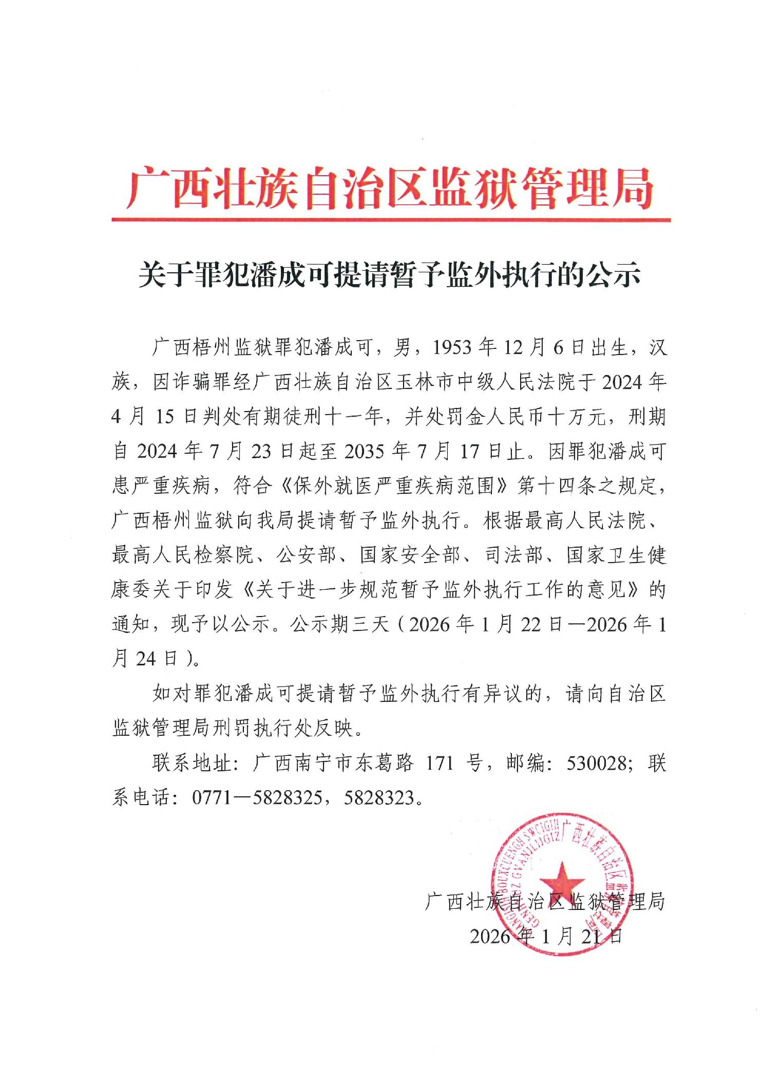 关于罪犯潘成可提请暂予监外执行的公示