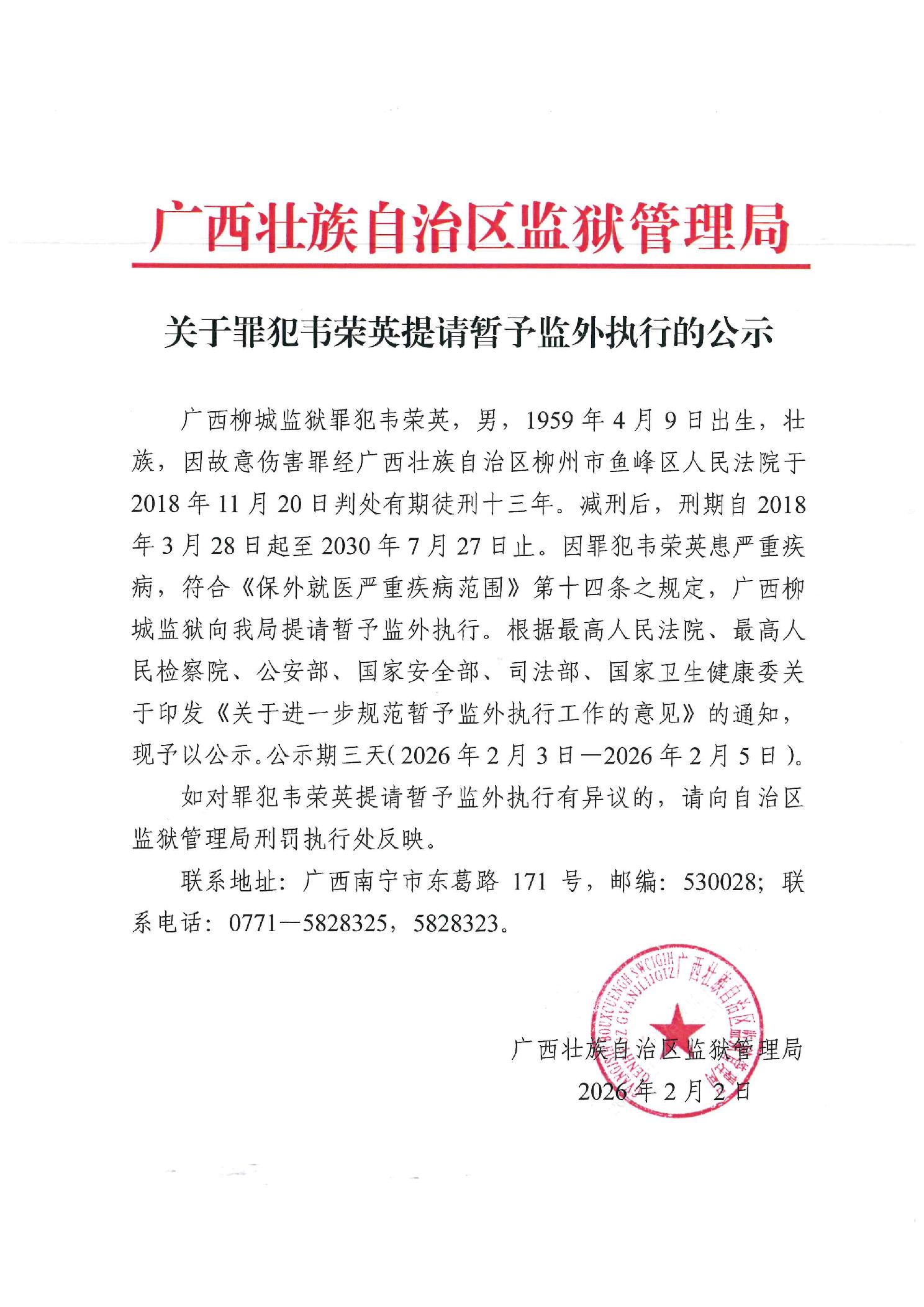 关于罪犯韦荣英提请暂予监外执行的公示