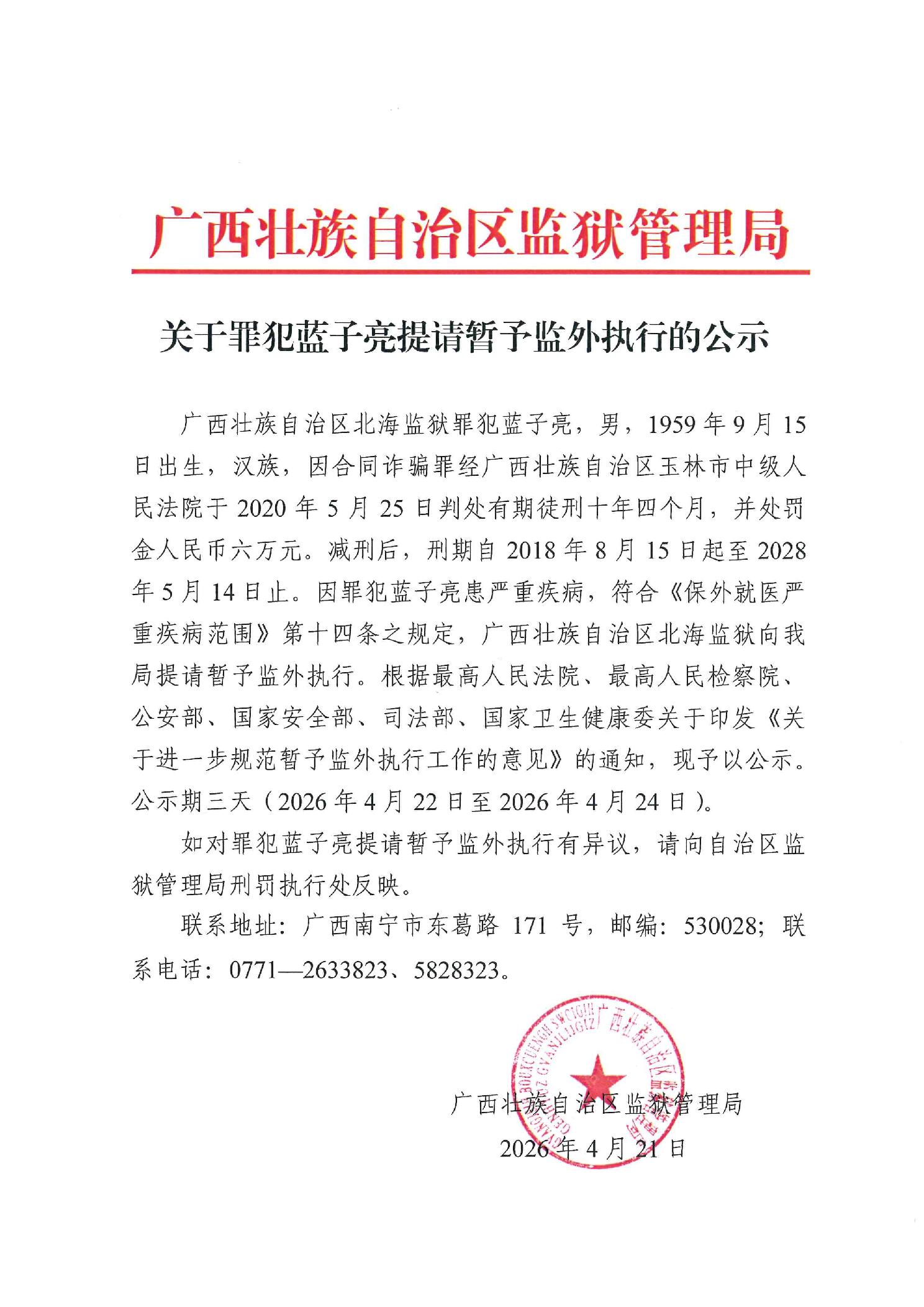 关于罪犯蓝子亮提请暂予监外执行的公示