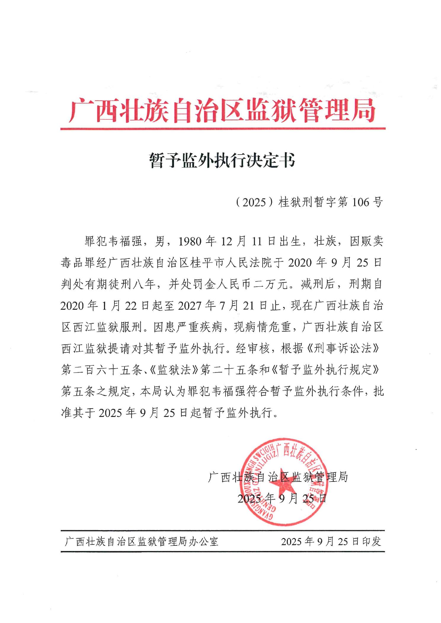暂予监外执行决定书(2025)桂狱刑暂字第106号