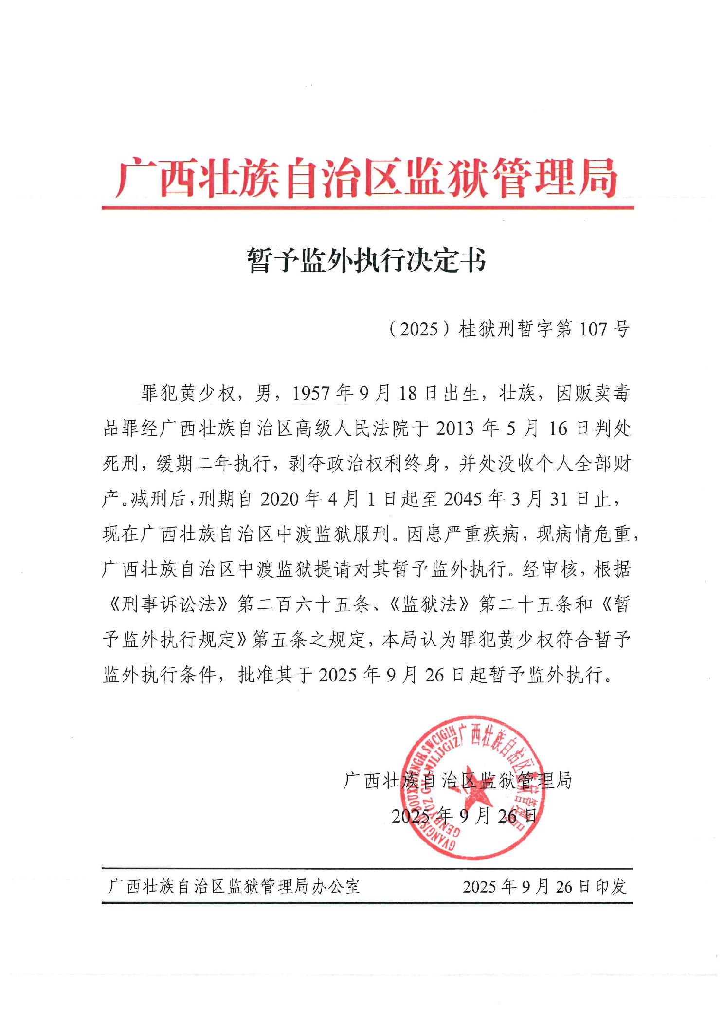 暂予监外执行决定书(2025)桂狱刑暂字第107号