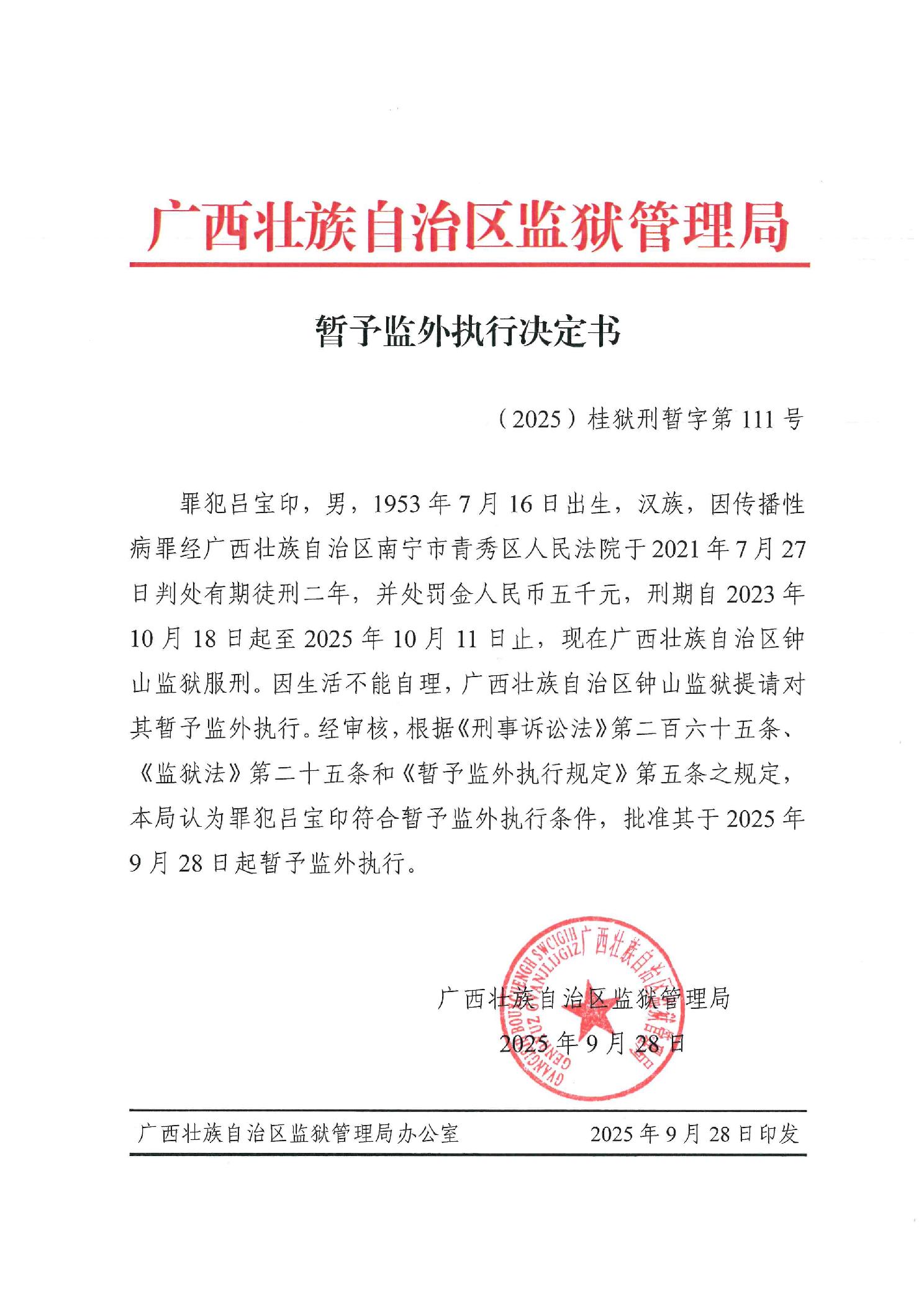暂予监外执行决定书(2025)桂狱刑暂字第111号