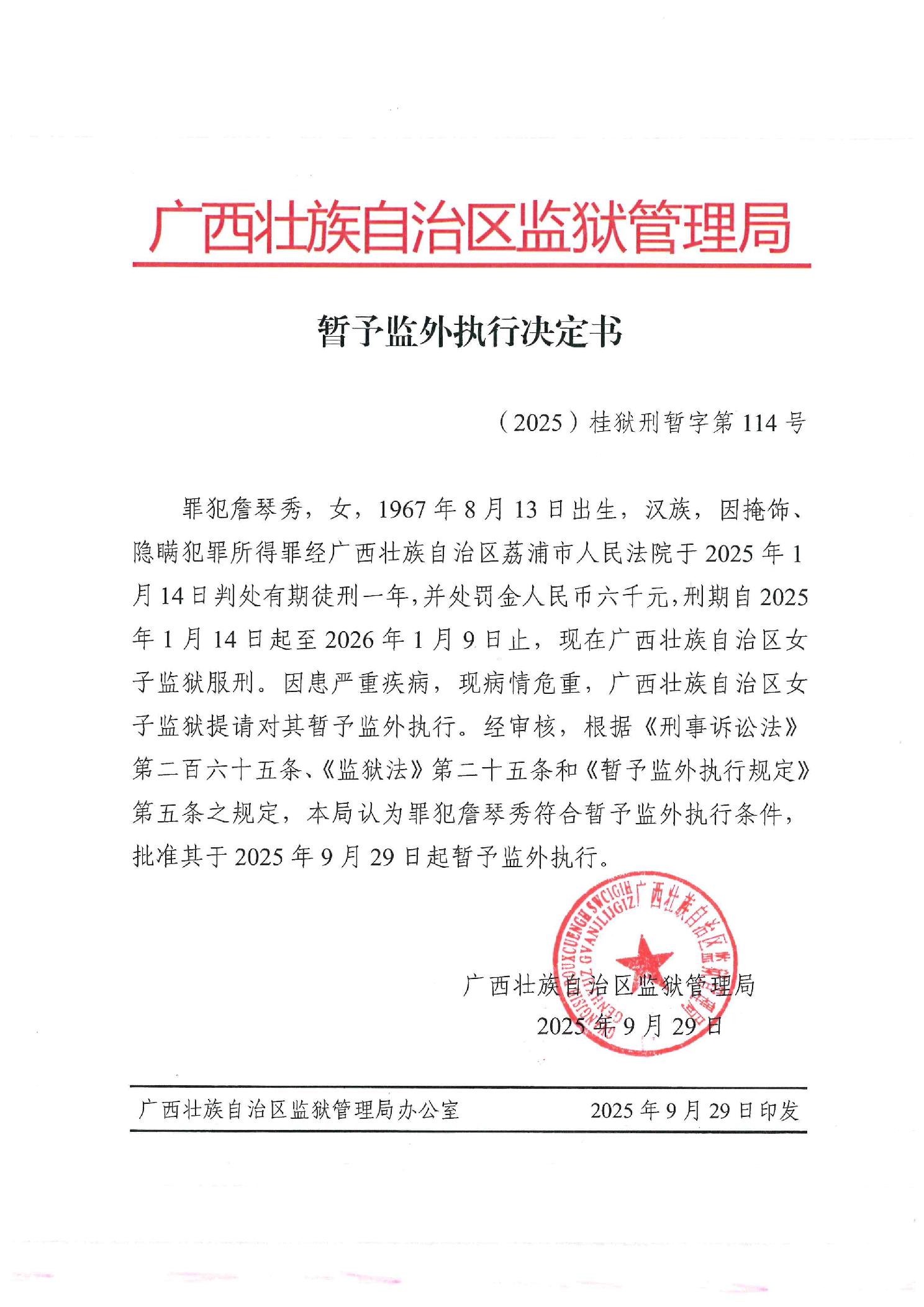 暂予监外执行决定书(2025)桂狱刑暂字第114号