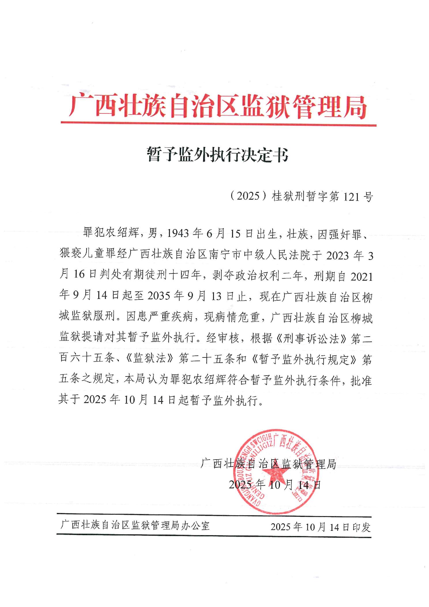 暂予监外执行决定书(2025)桂狱刑暂字第121号