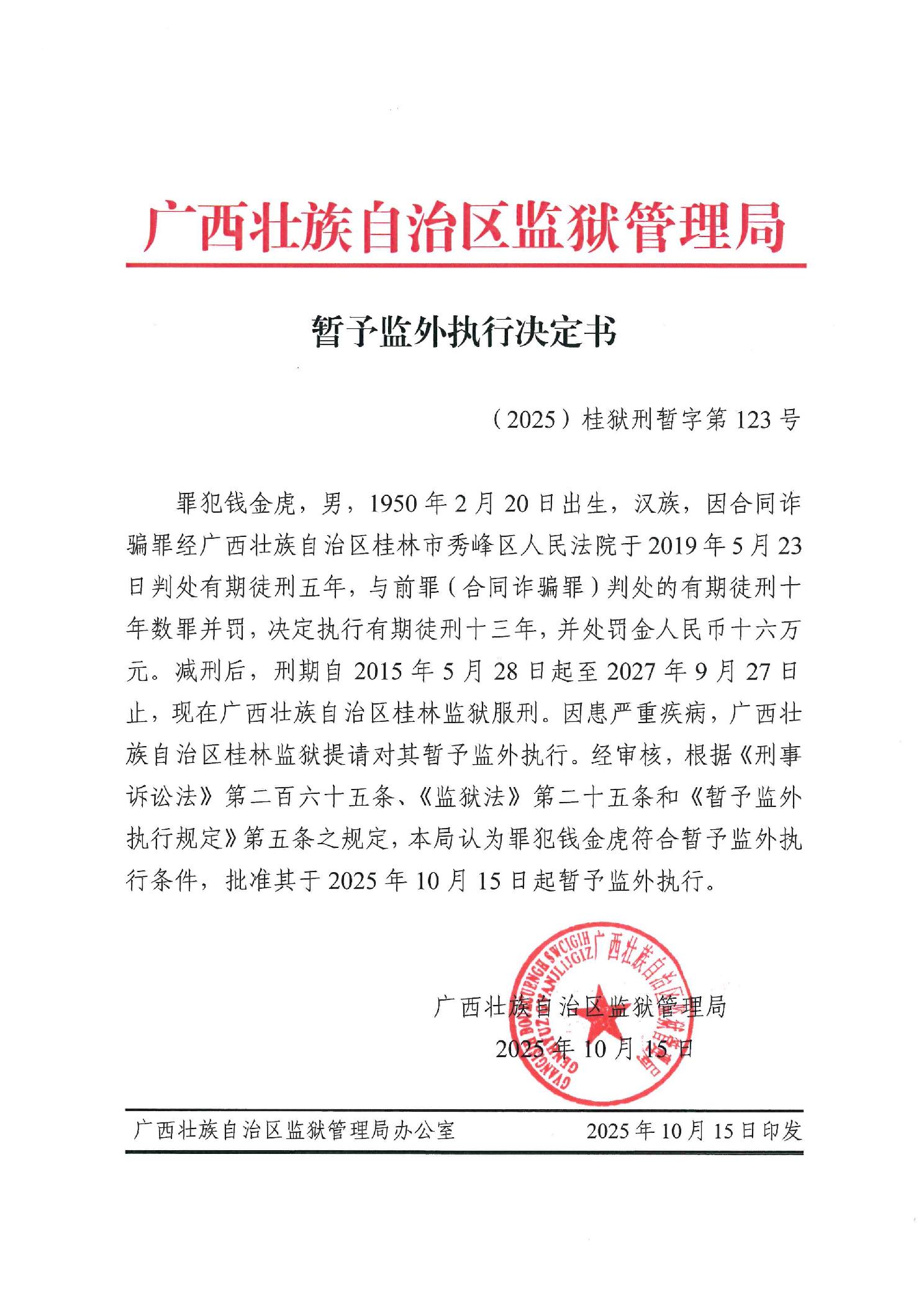 暂予监外执行决定书(2025)桂狱刑暂字第123号