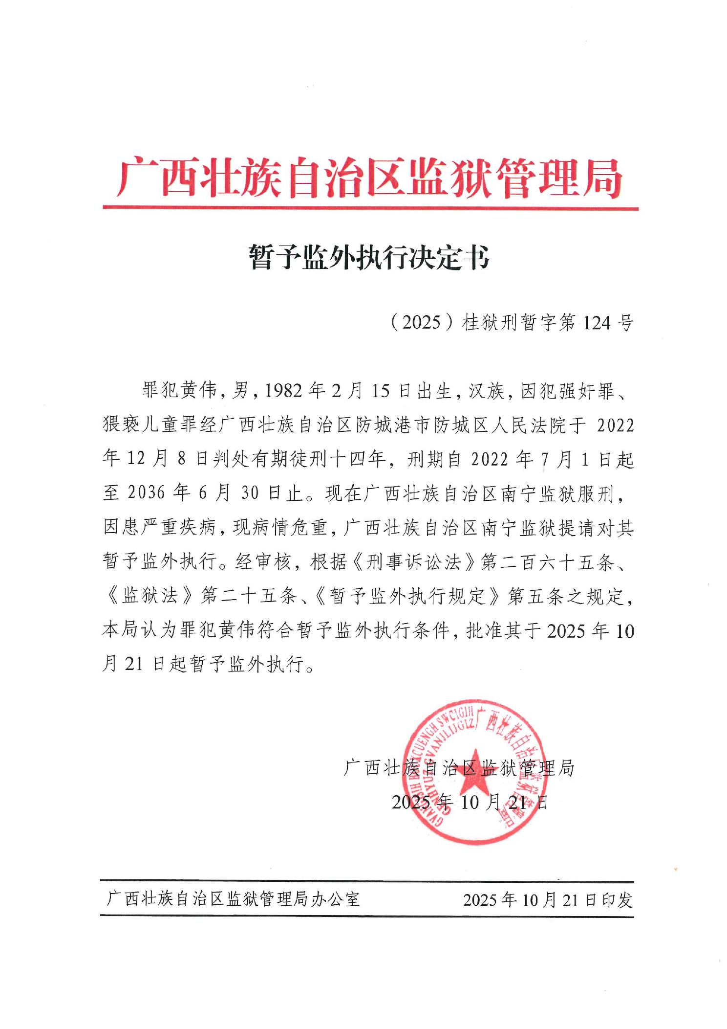 暂予监外执行决定书(2025)桂狱刑暂字第124号