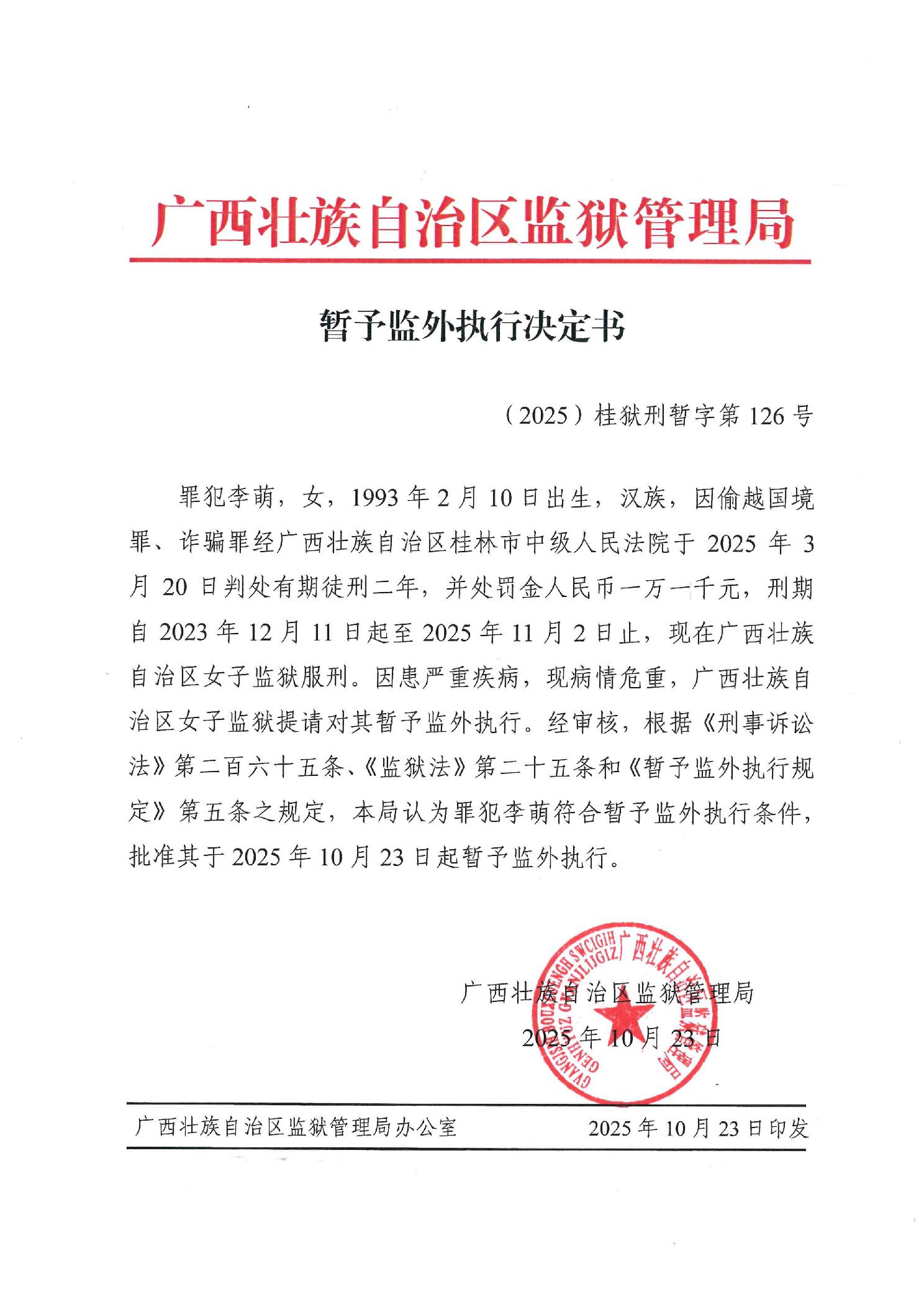 暂予监外执行决定书(2025)桂狱刑暂字第126号