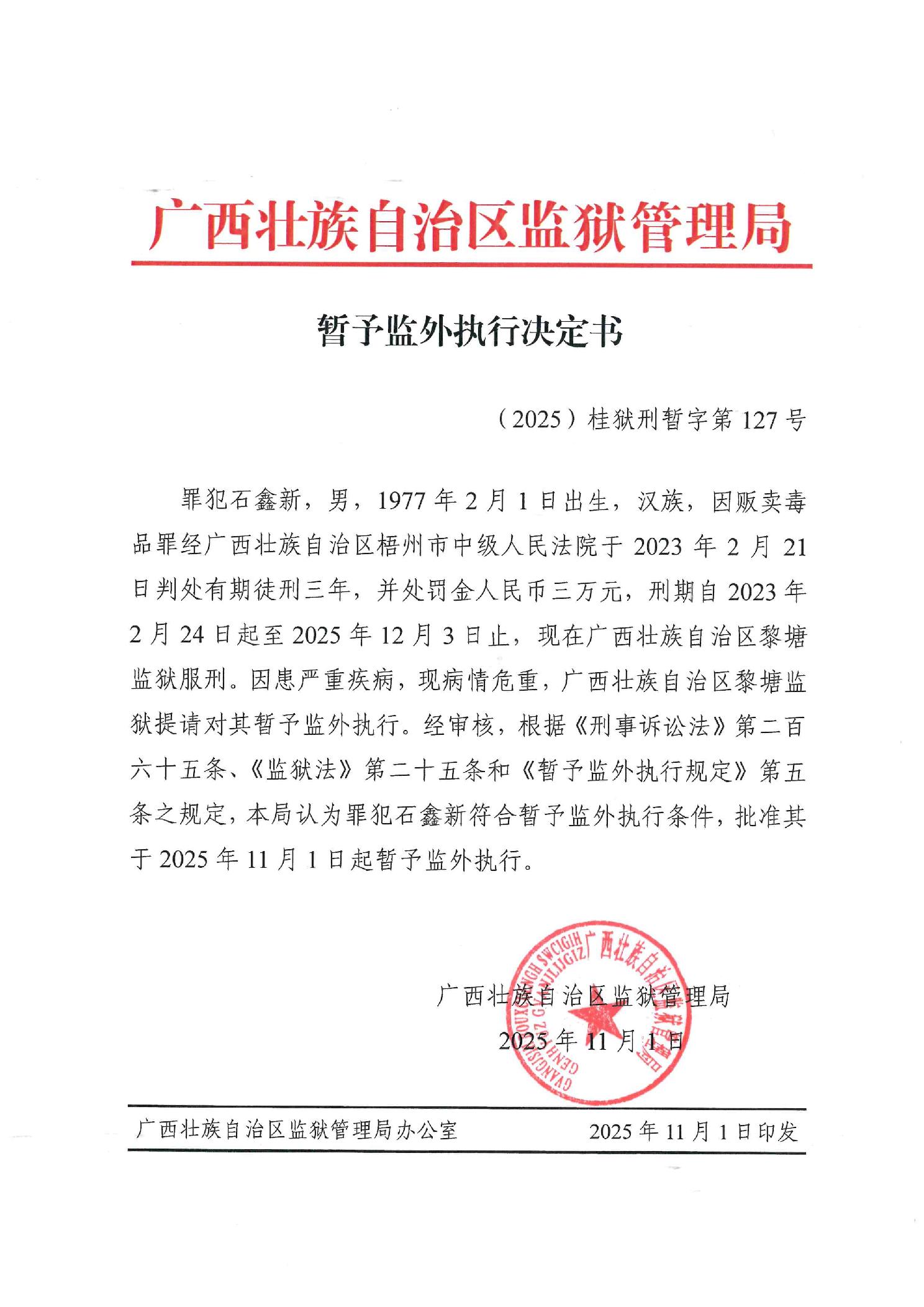 暂予监外执行决定书(2025)桂狱刑暂字第127号