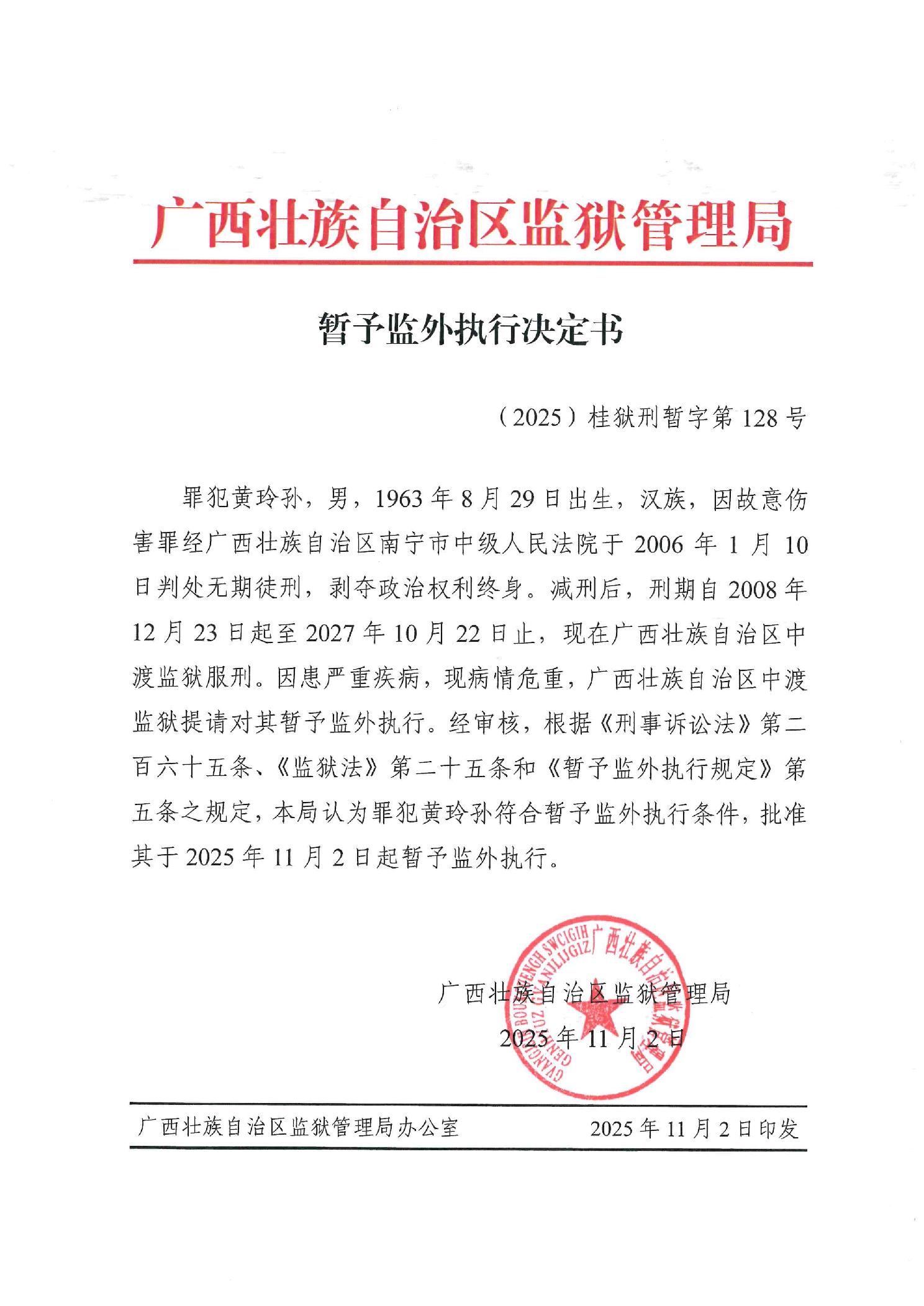 暂予监外执行决定书(2025)桂狱刑暂字第128号
