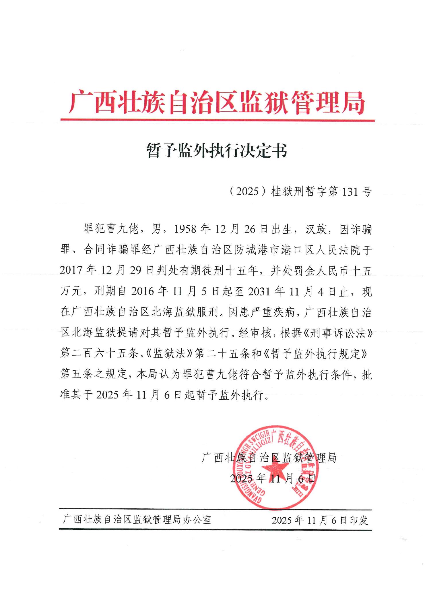 暂予监外执行决定书(2025)桂狱刑暂字第131号