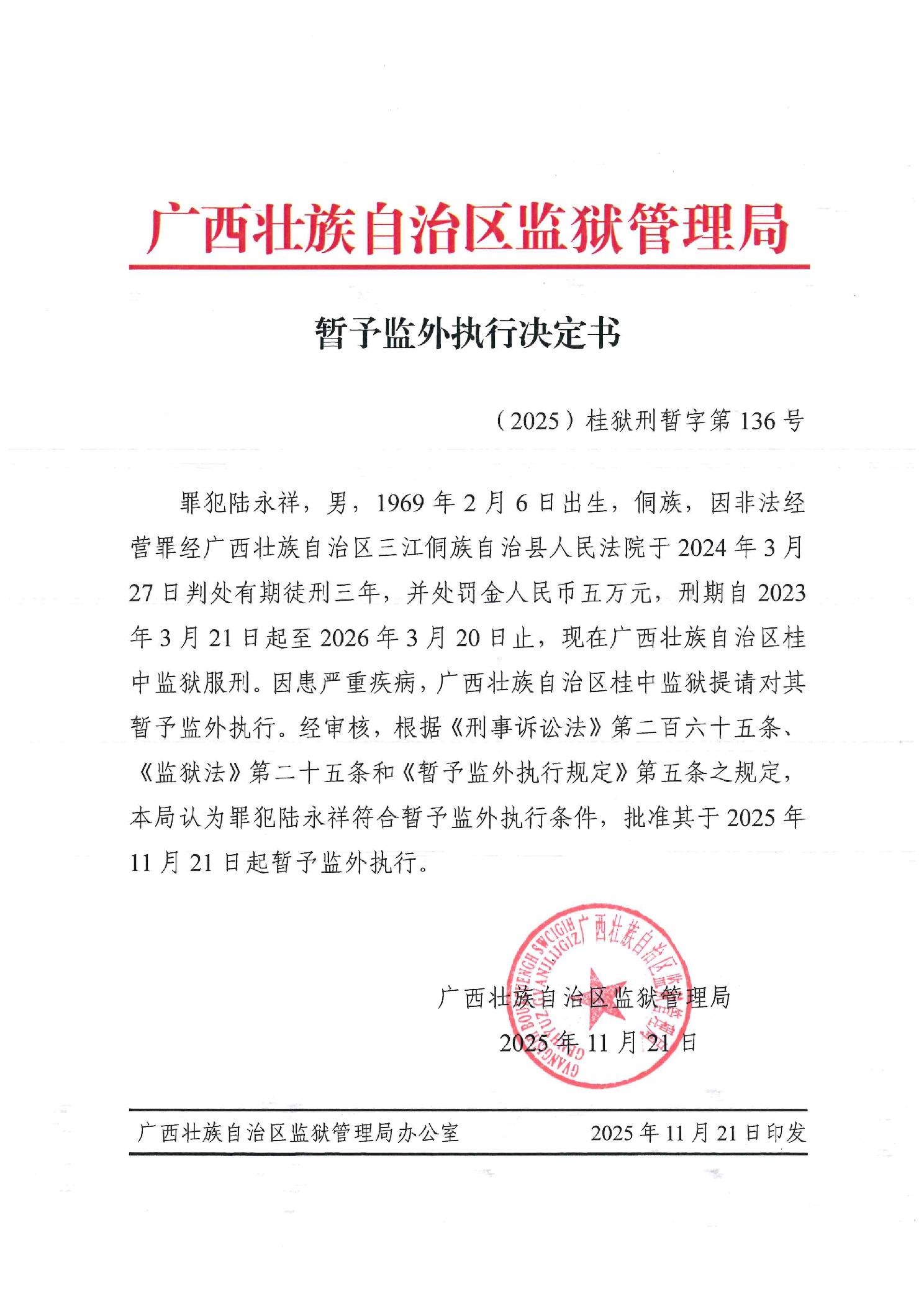 暂予监外执行决定书(2025)桂狱刑暂字第136号