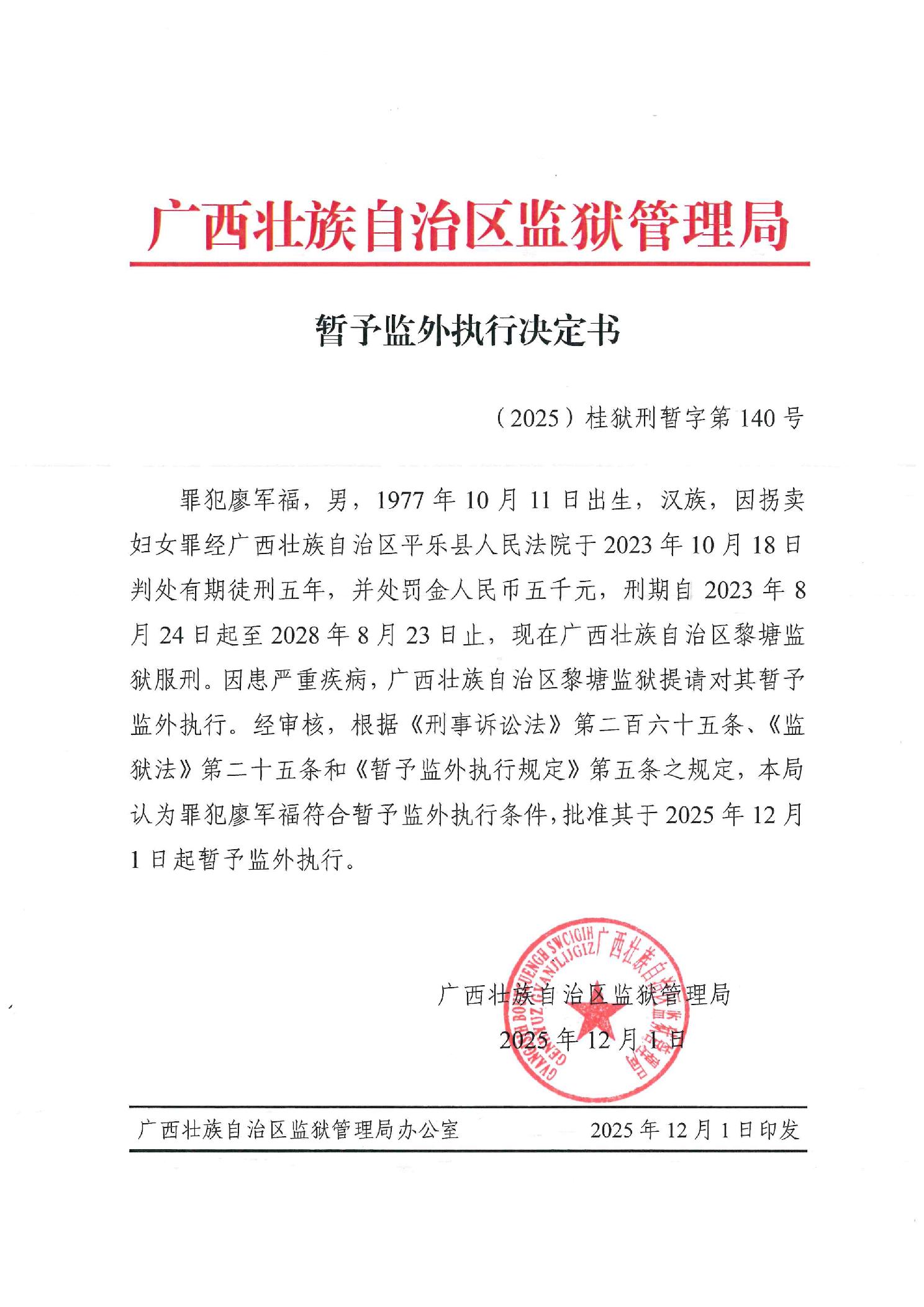 暂予监外执行决定书(2025)桂狱刑暂字第140号