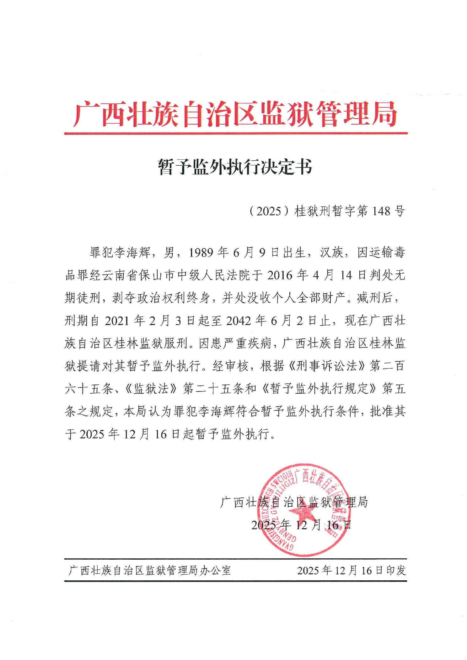 暂予监外执行决定书(2025)桂狱刑暂字第148号