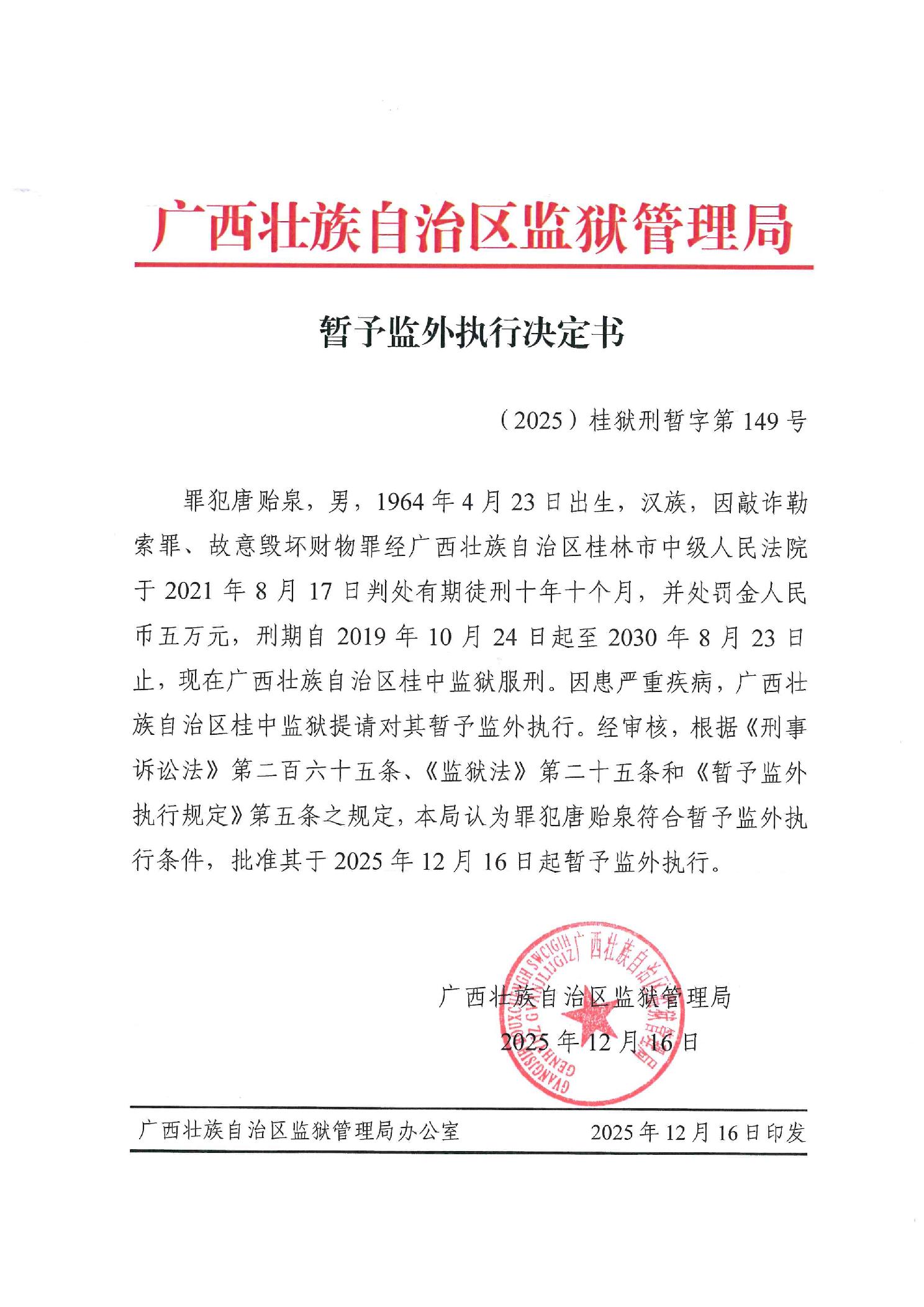 暂予监外执行决定书(2025)桂狱刑暂字第149号