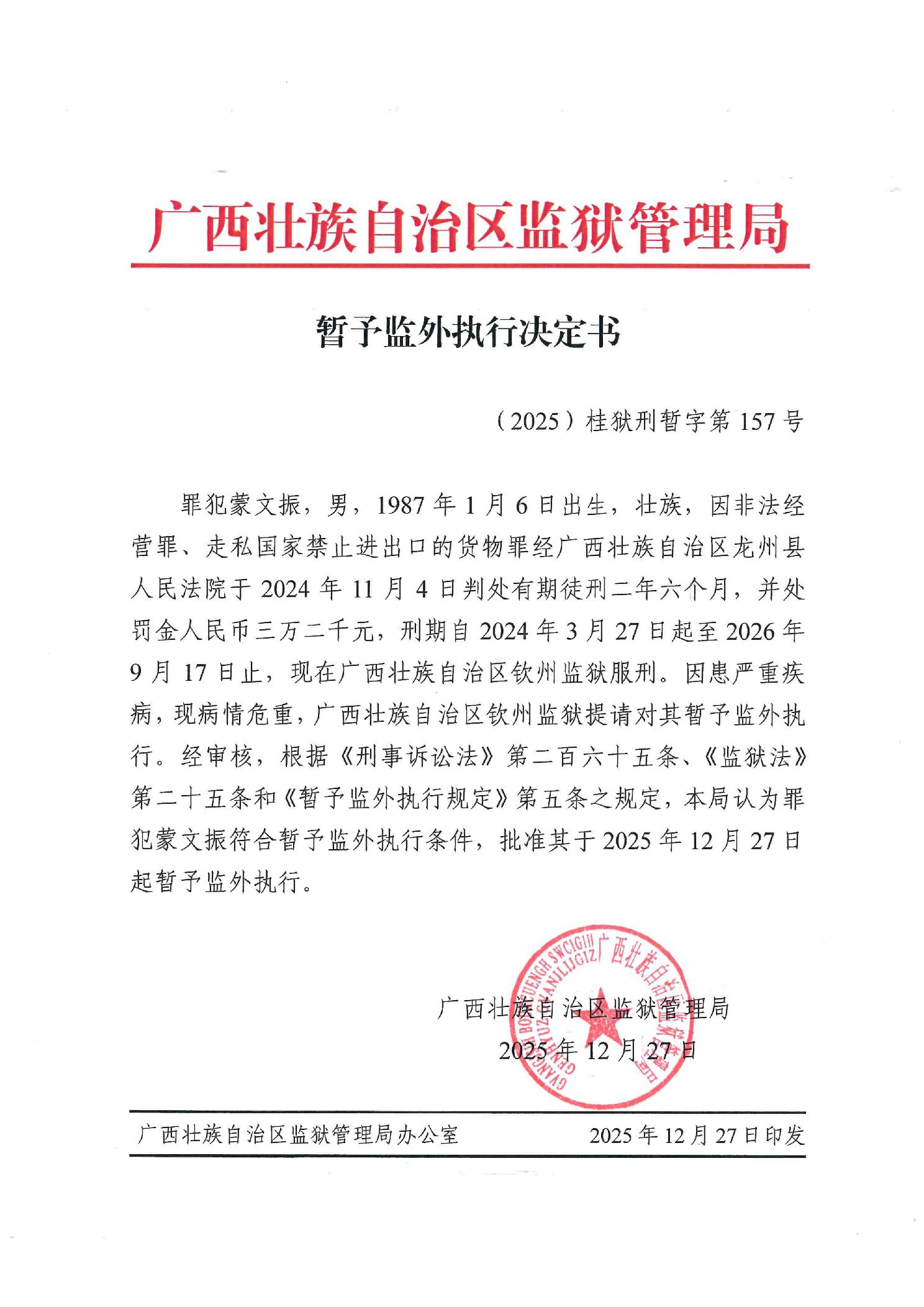 暂予监外执行决定书(2025)桂狱刑暂字第157号