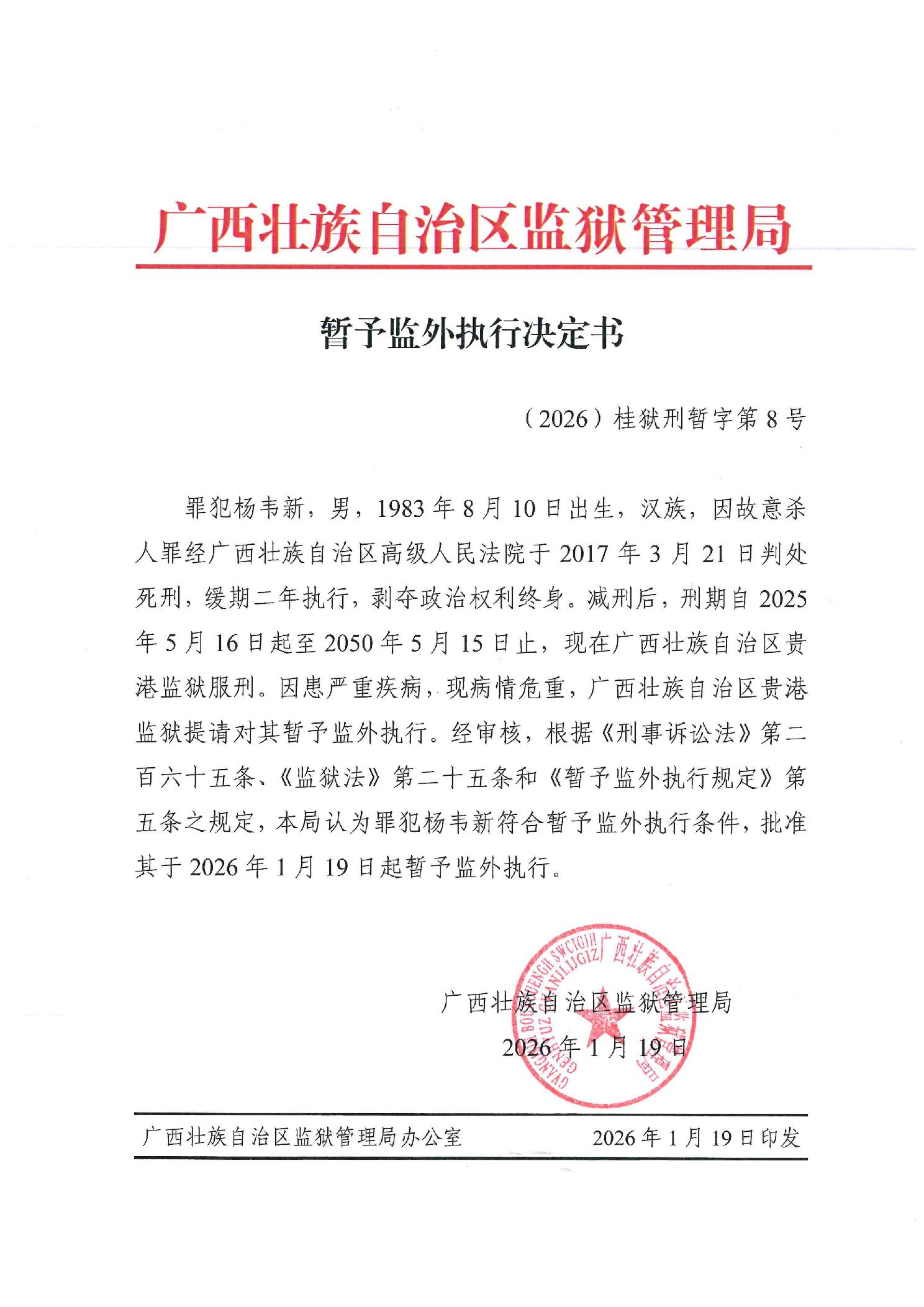 暂予监外执行决定书(2026)桂狱刑暂字第8号