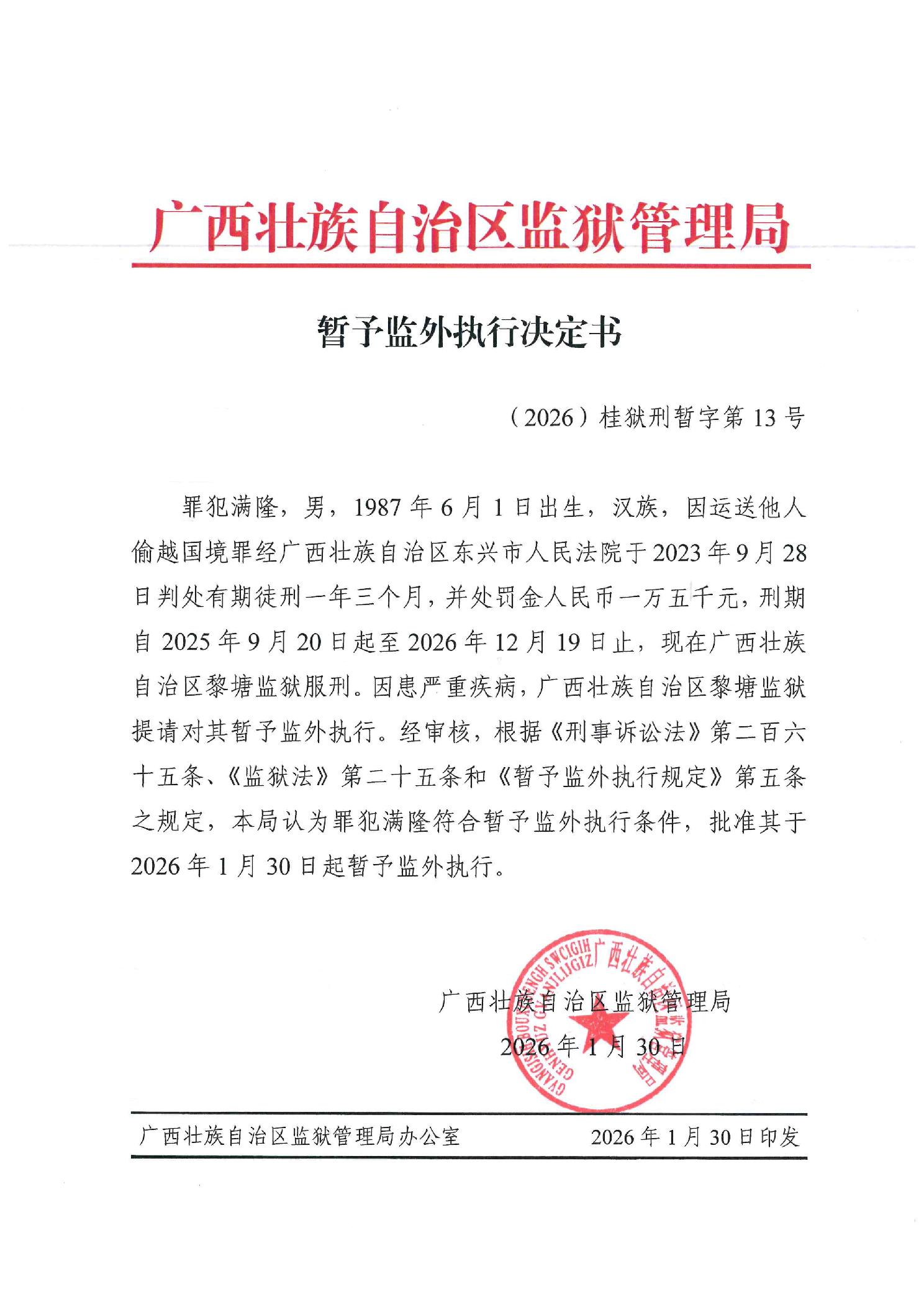 暂予监外执行决定书(2026)桂狱刑暂字第13号