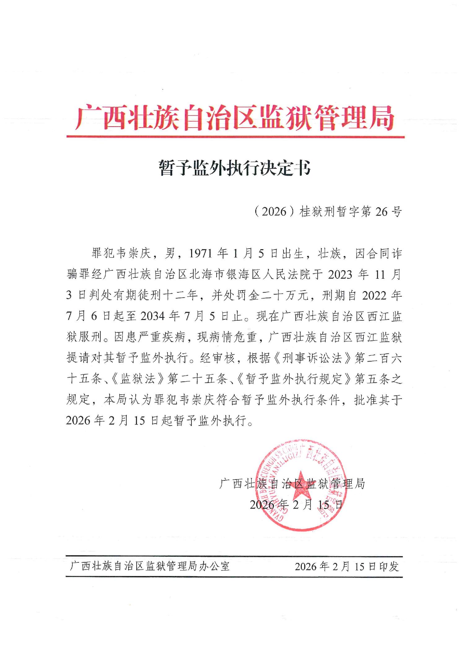 暂予监外执行决定书(2026)桂狱刑暂字第26号