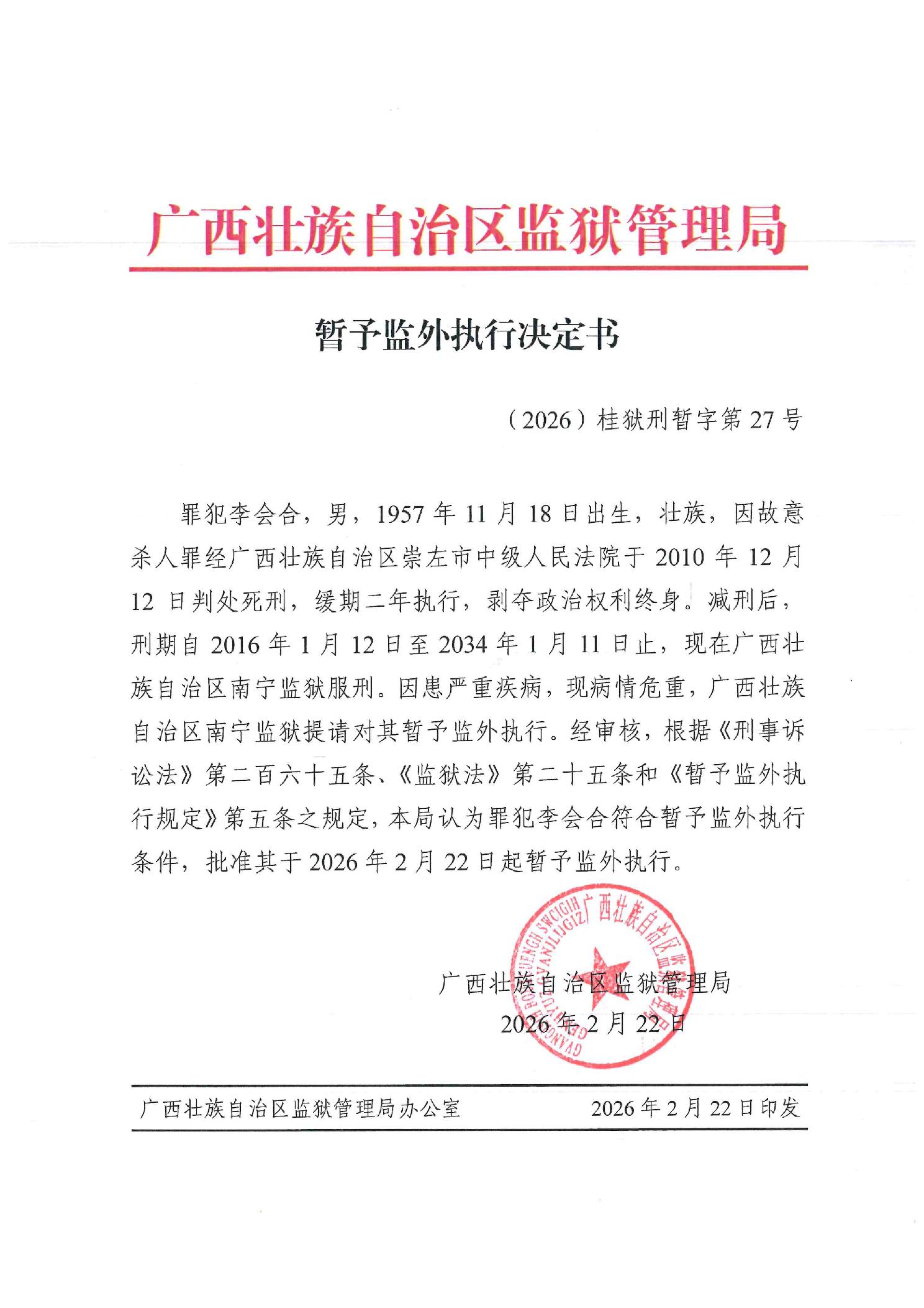 暂予监外执行决定书(2026)桂狱刑暂字第27号