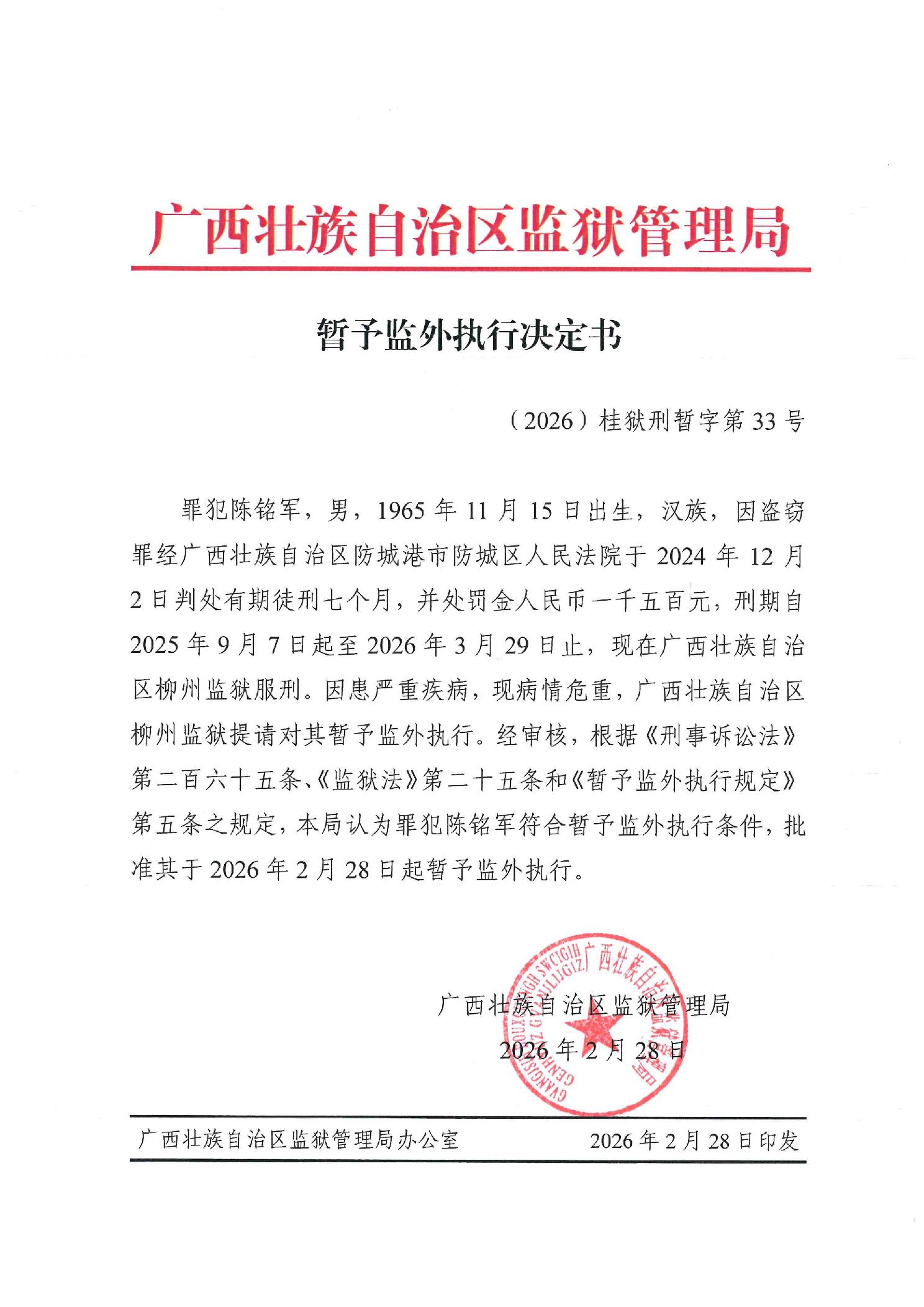 暂予监外执行决定书(2026)桂狱刑暂字第33号