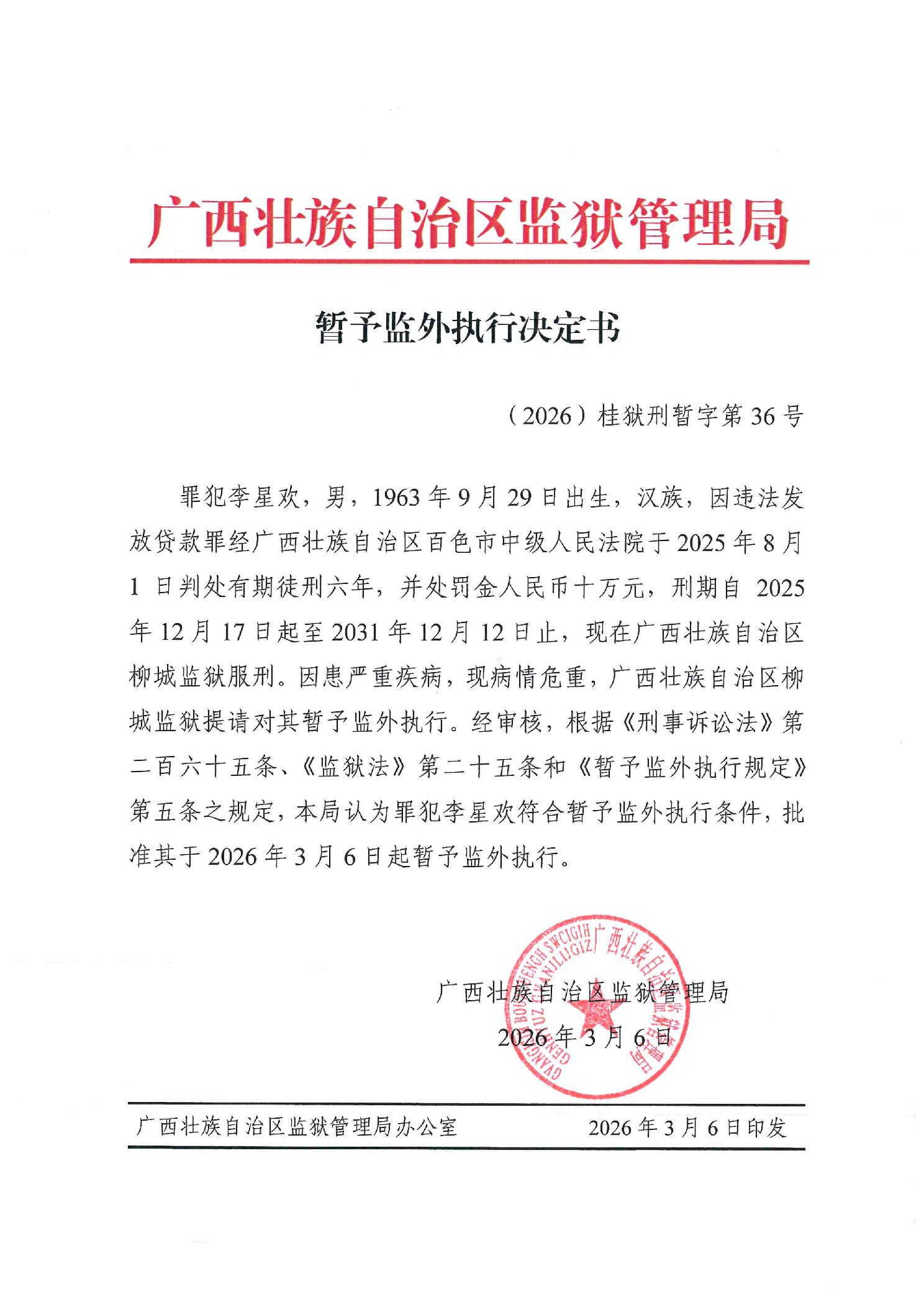 暂予监外执行决定书(2026)桂狱刑暂字第36号
