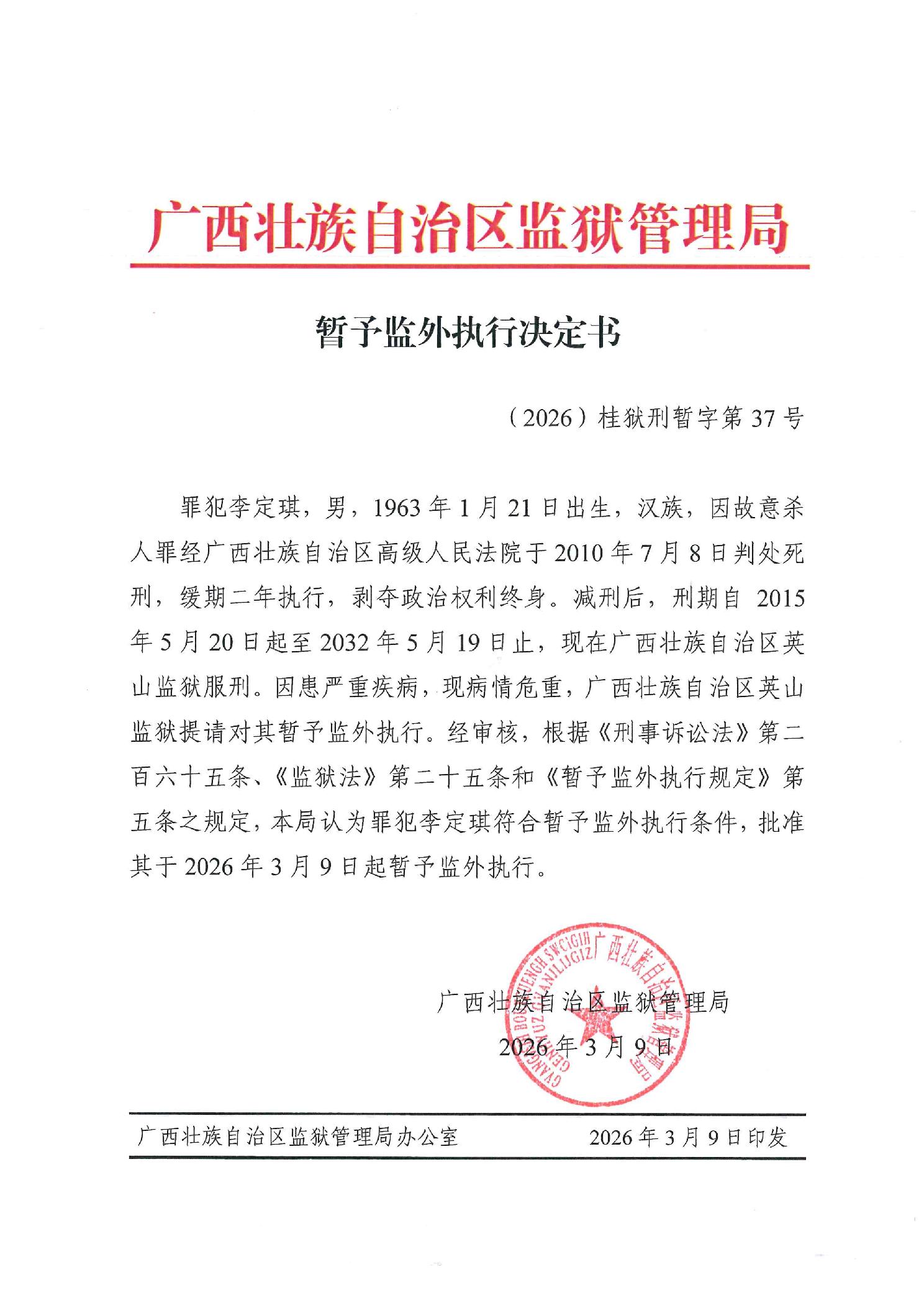 暂予监外执行决定书(2026)桂狱刑暂字第37号