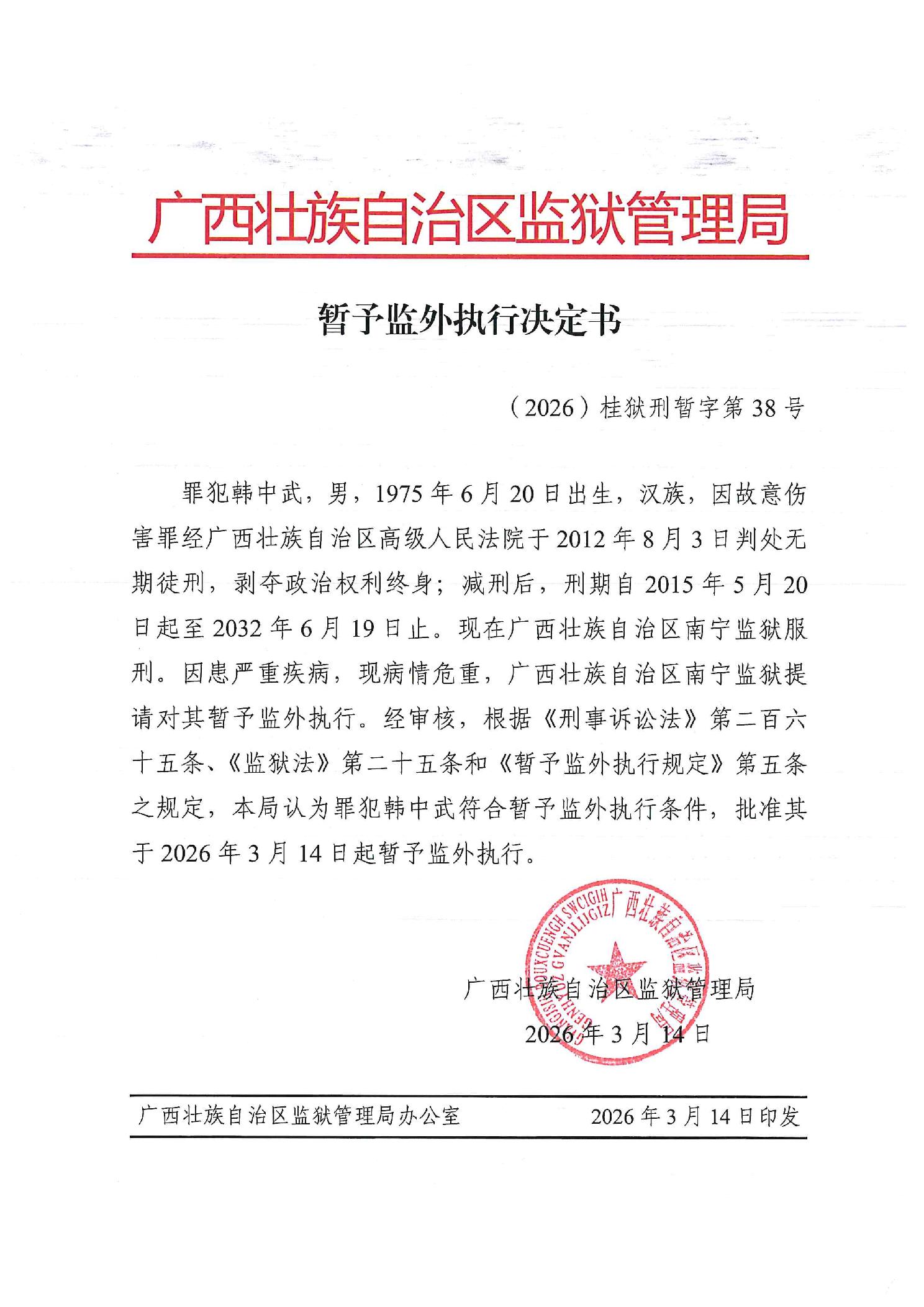 暂予监外执行决定书(2026)桂狱刑暂字第38号