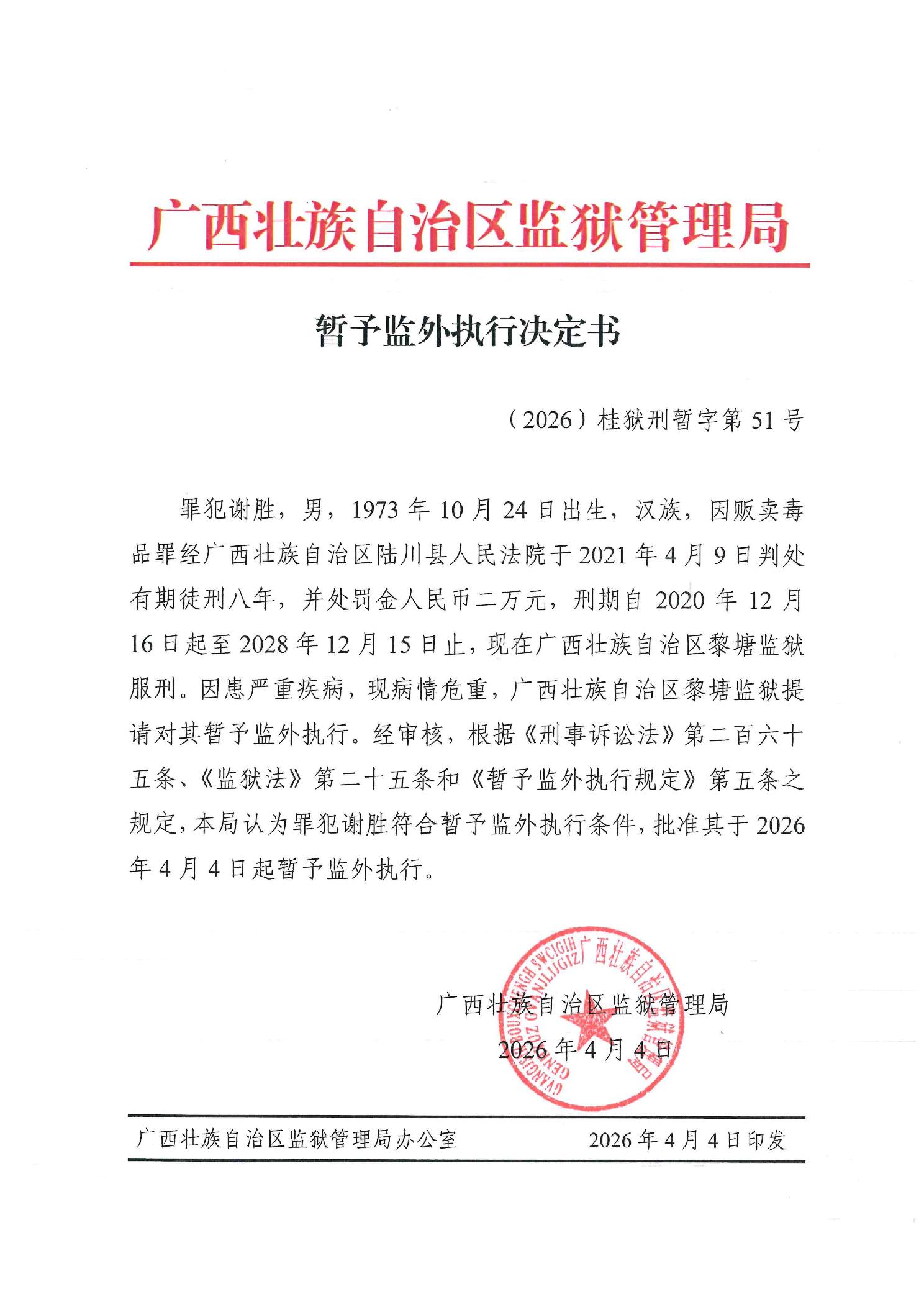 暂予监外执行决定书(2026)桂狱刑暂字第51号