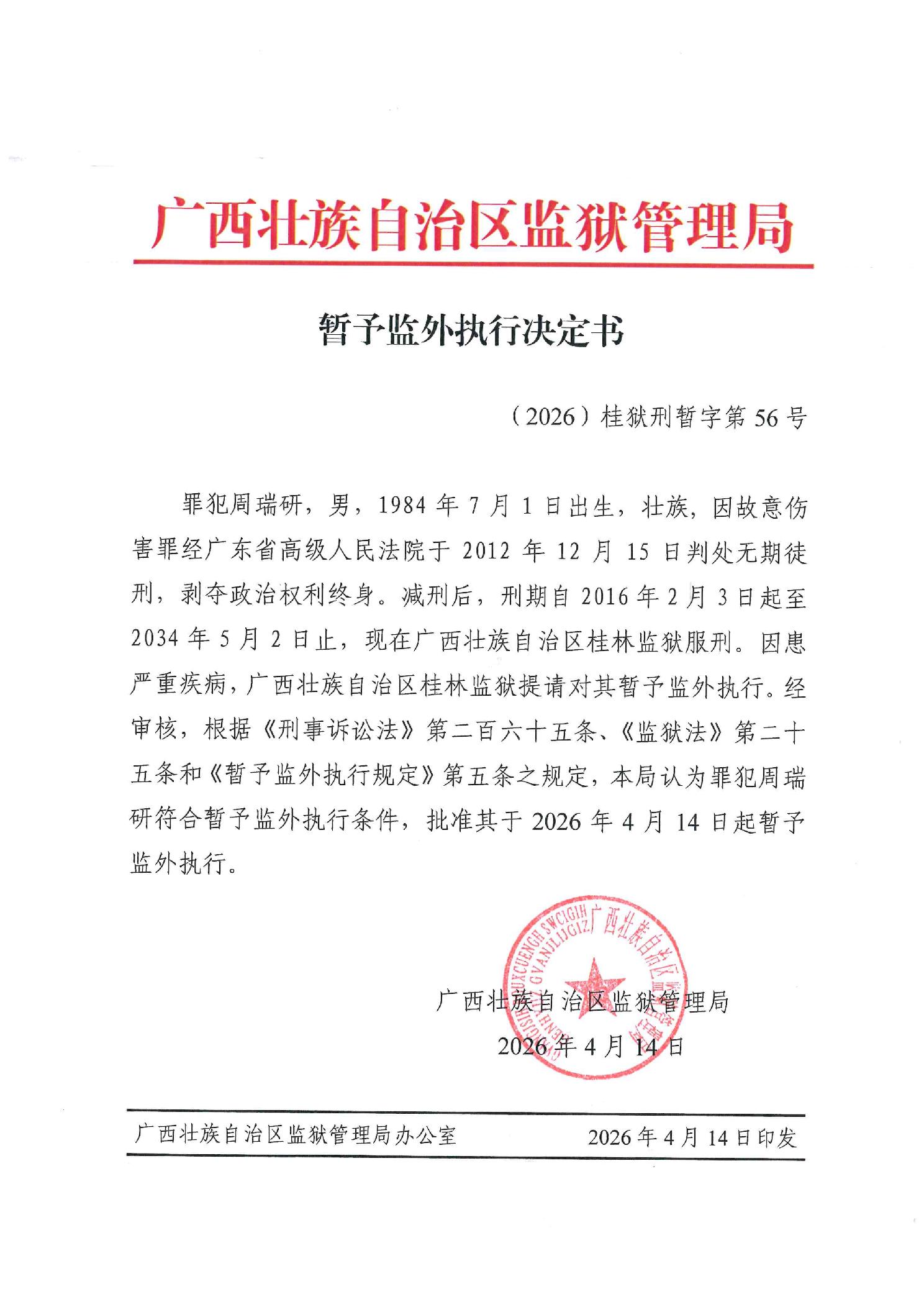 暂予监外执行决定书(2026)桂狱刑暂字第56号