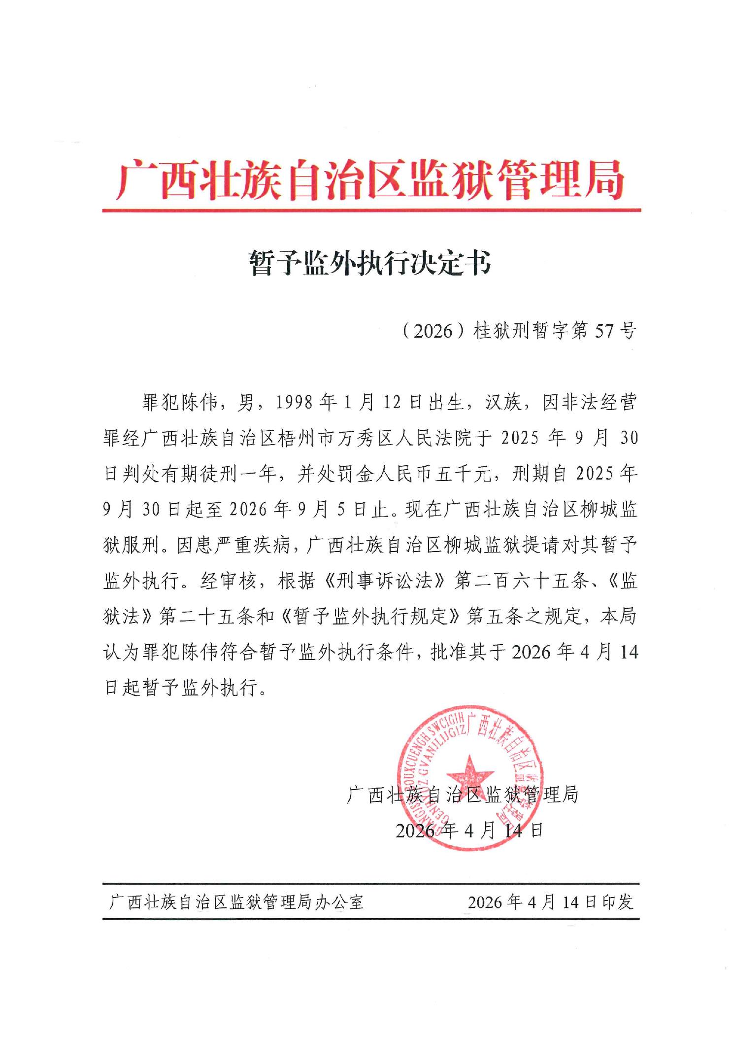 暂予监外执行决定书(2026)桂狱刑暂字第57号