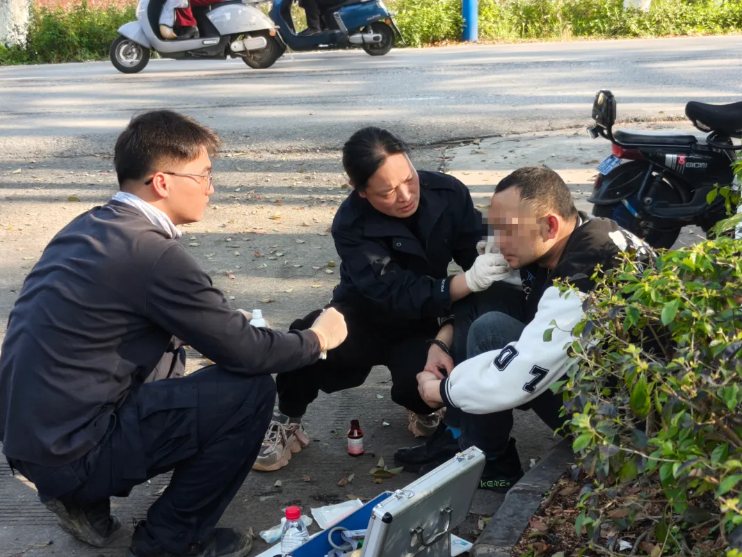 不到一分钟,备勤医生麦永英携带急救箱抵达现场。在确认没有其他伤势情况后,使用碘伏由内向外消毒伤口、清理异物,完成包扎处理。三人分工协作、规范处置,整个过程快速有序,及时缓解了伤者伤情。