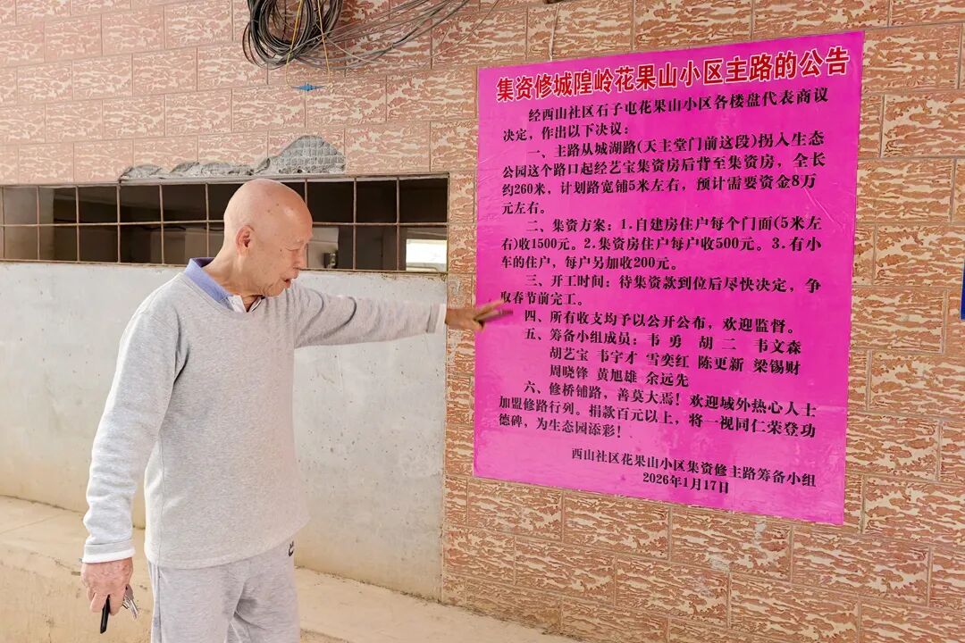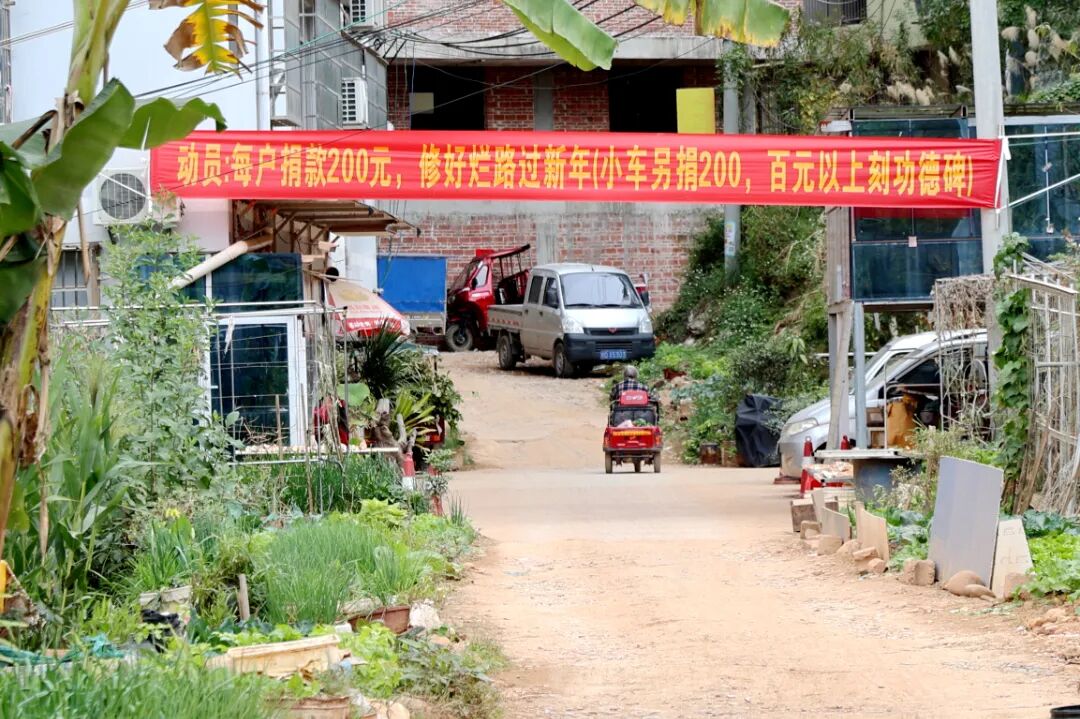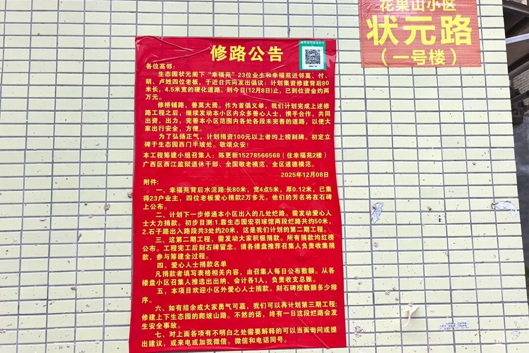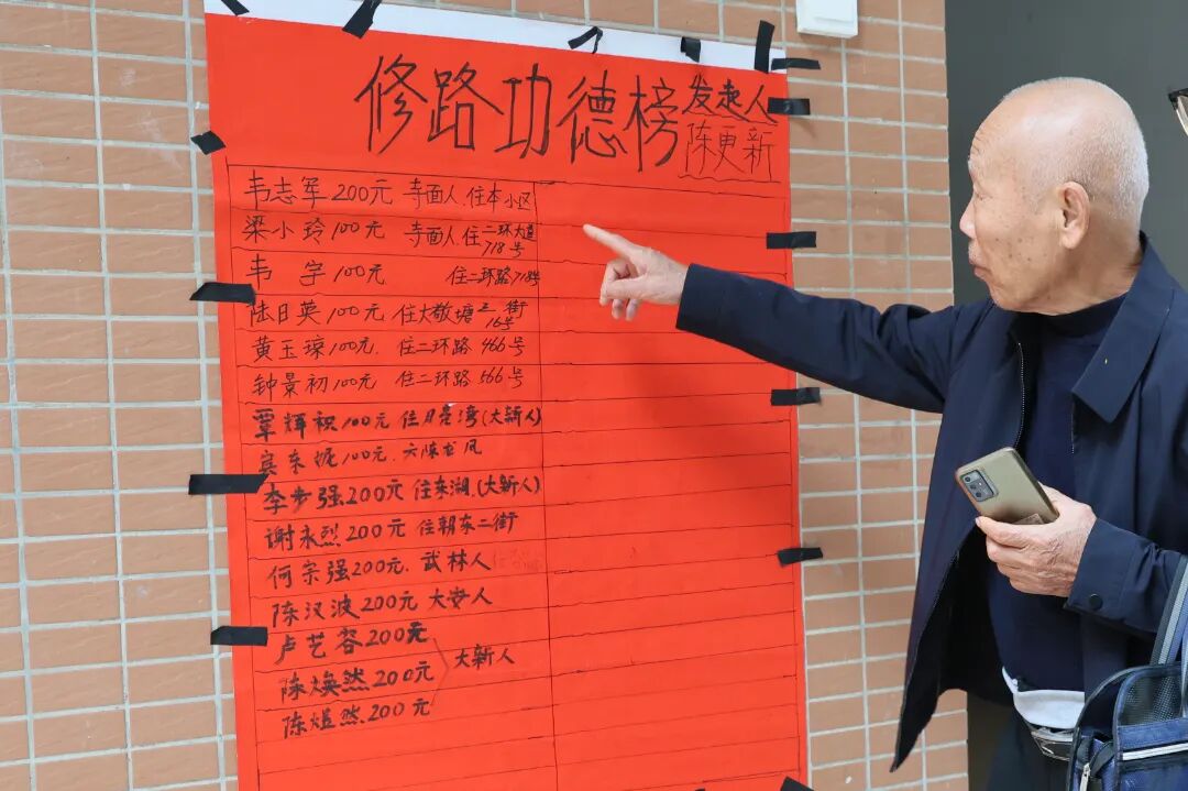 2025年12月8日,陈更新率先行动,在小区张贴《修路公告》,悬挂横幅,向周边群众发出修路倡议,并带头捐款2000元。他的善举迅速引发共鸣,邻里乡亲纷纷响应,短短十天时间,捐款便突破万元,为修路工作打下了坚实的基础。