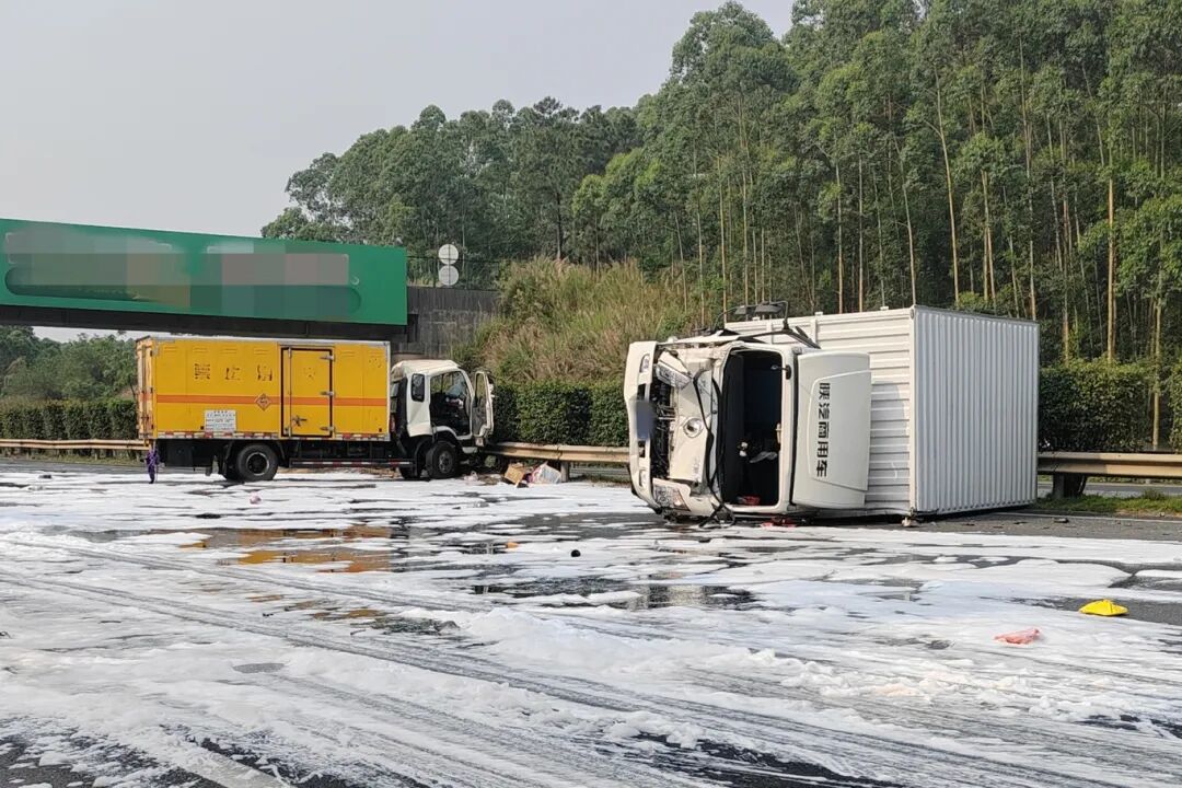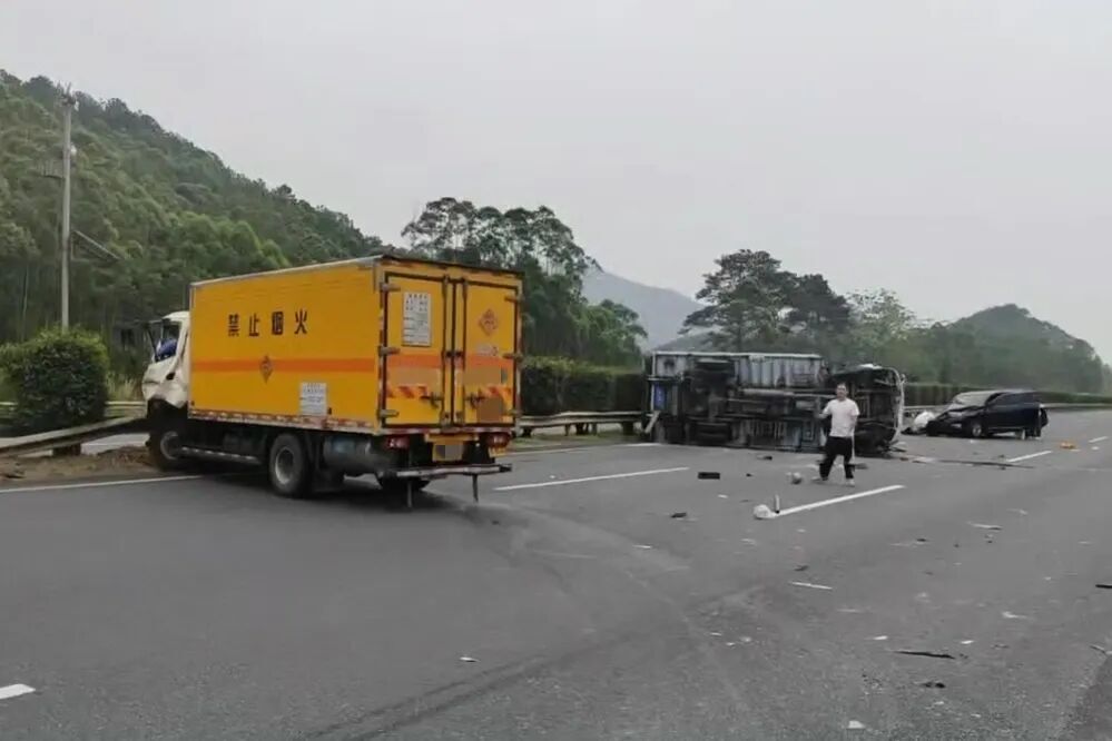 3月21日14时40分许,兰海高速G75段2077处(兰海高速广西钦州段)发生事故。一辆标注“禁止烟火”的重型货车与一辆厢式货车、一辆越野车发生连环碰撞,现场燃油汩汩泄漏,3辆车的5名司乘人员均被困车内。