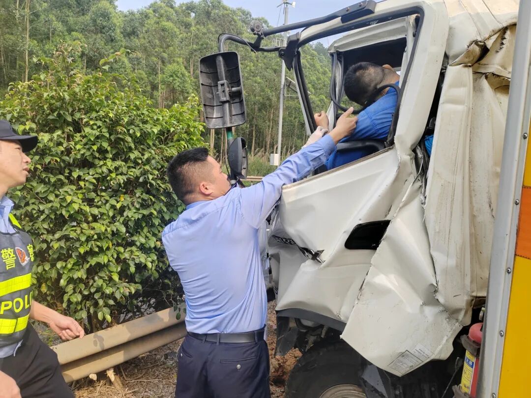 交警、消防员、医护人员到达现场后,吴晓远向现场指挥员报告危化品位置、燃油泄漏范围、被困人员具体分布、已采取的先期措施等信息。他协助消防人员精准定位救援突破口,配合交警划定警戒区域、引导后续车辆有序分流。
